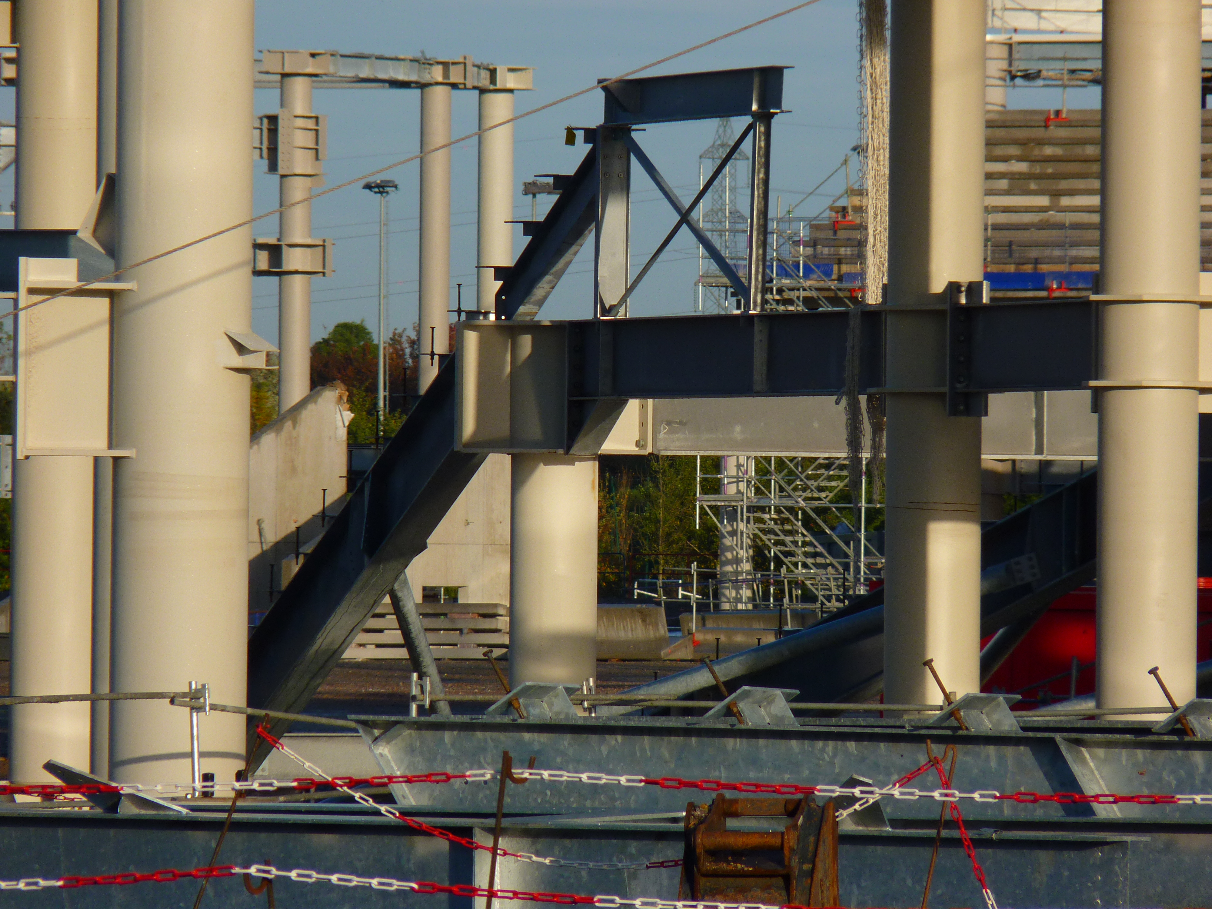 - La pose des poteaux pour prolonger la tribune ouest a débuté ! On voit 3 types différents et dont ceux qui porteront les grand escaliers extérieurs: