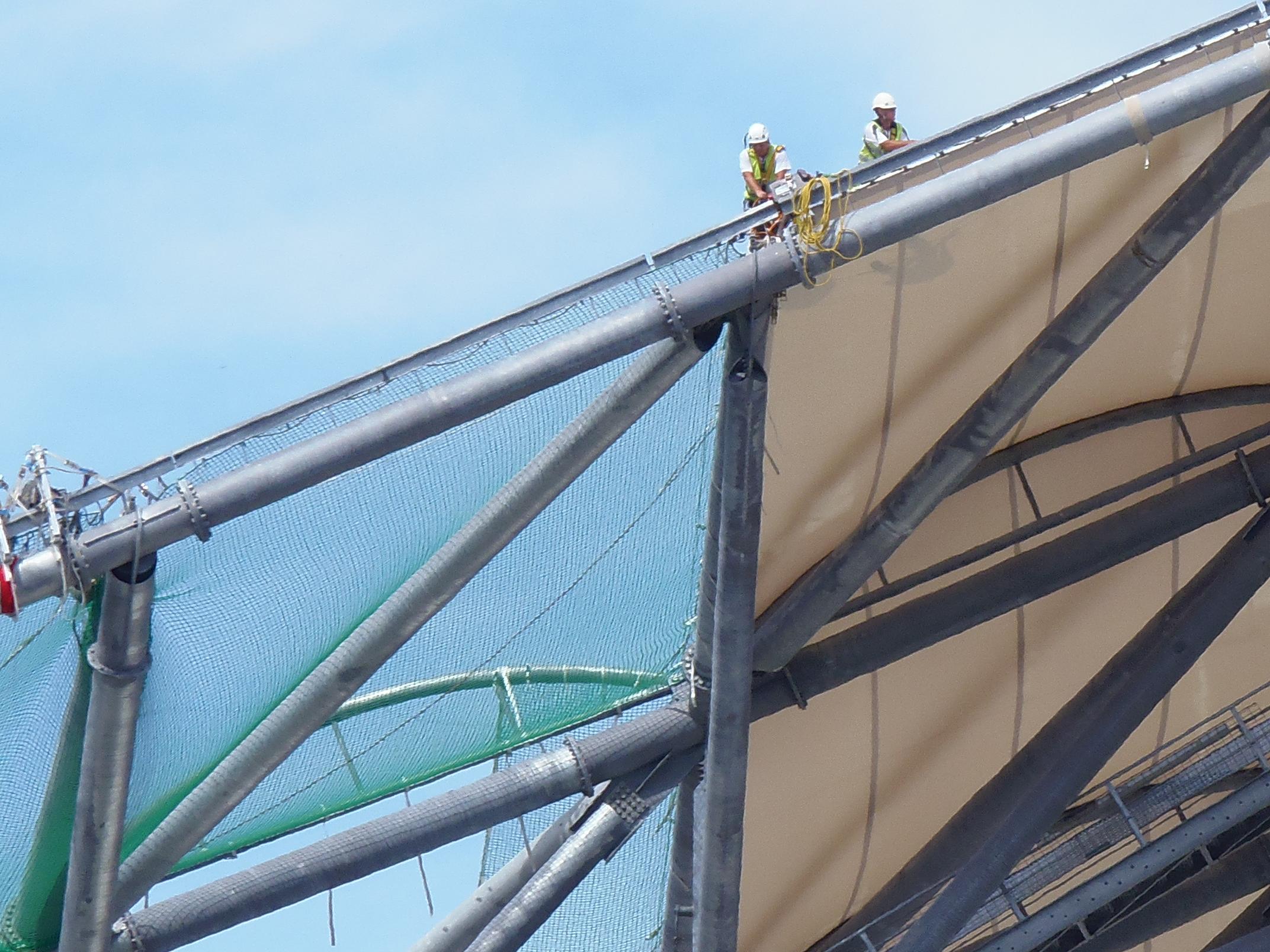 il y a une passerelle pour l'entretien courant de la charpente et des installation électriques. en dehors des changements de couverture très occasionnels, il n'y a pas de raison d'avoir besoin d'un accès permanent tout autours du toit...