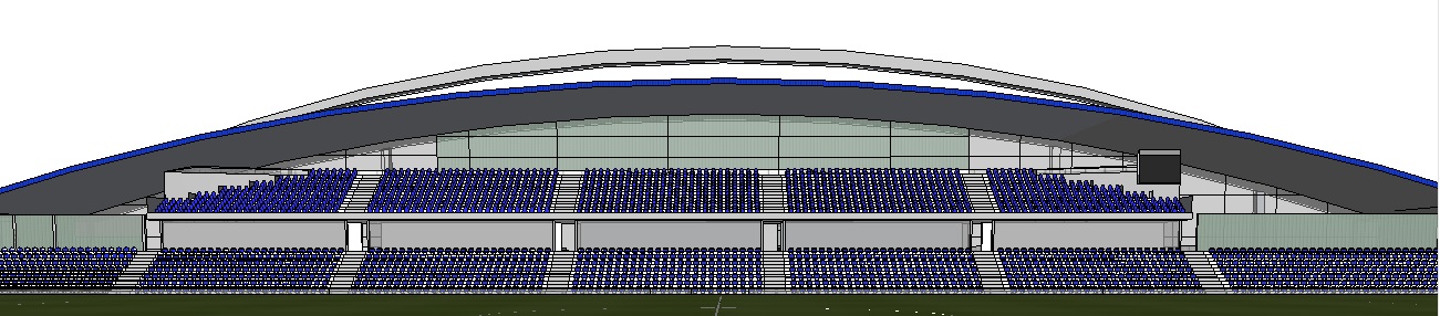 on peut voir le talus et le pourtour classé que je n'ai pas modifié, l'extension de la latérale prenant tout de même appui dessus. Les tribune sont tenues par de grands massifs qui font le look extérieur du stade :