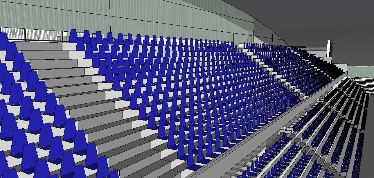 et enfin les latérales avec le bas reprofilé à cause de l'enterrement du terrain de 2m, ce qui permet de gagner des places et de se rapprocher du terrain pour un effet à l'anglaise. on a enfin un niveau supplémentaire de gradins en haut :