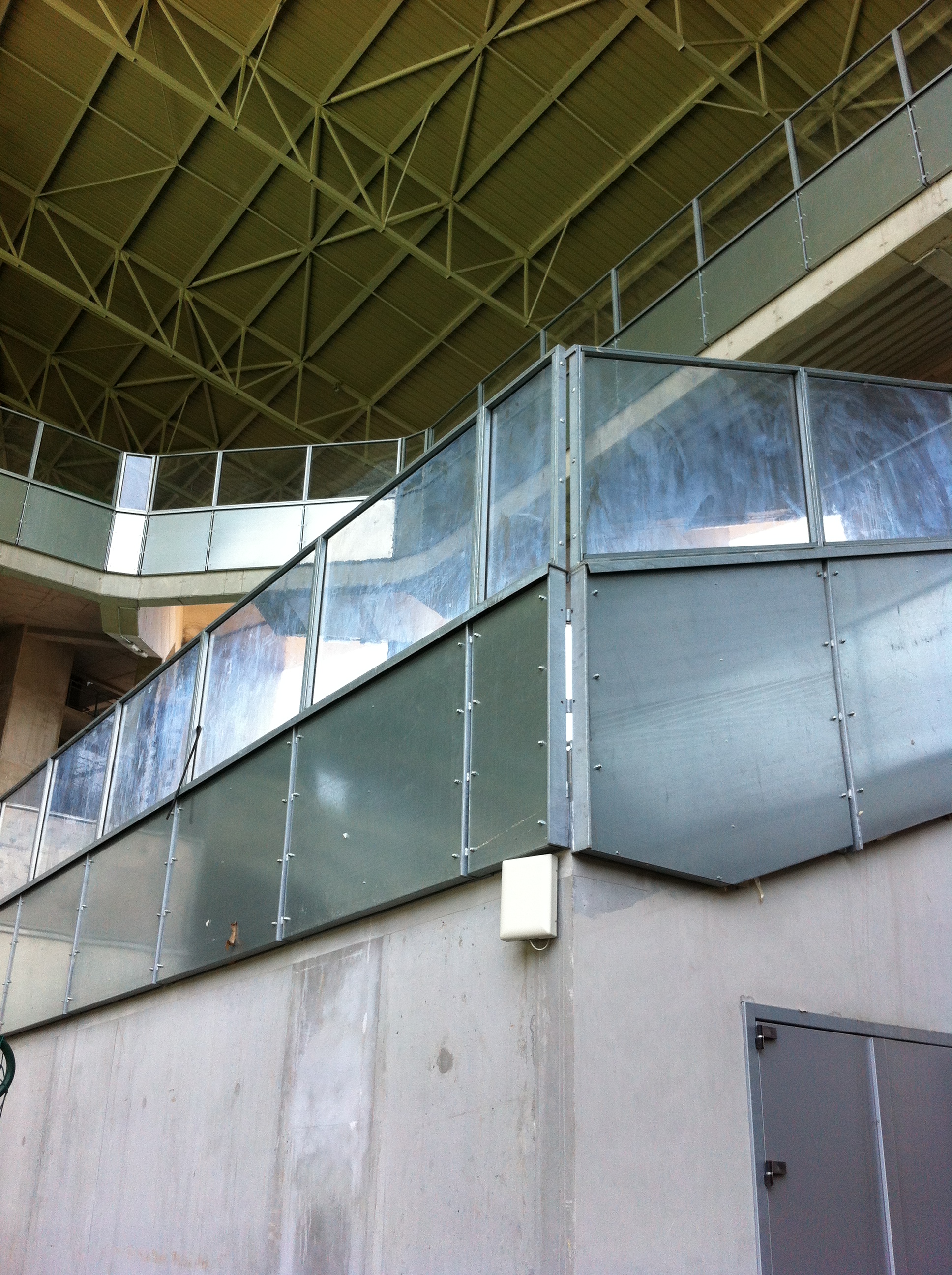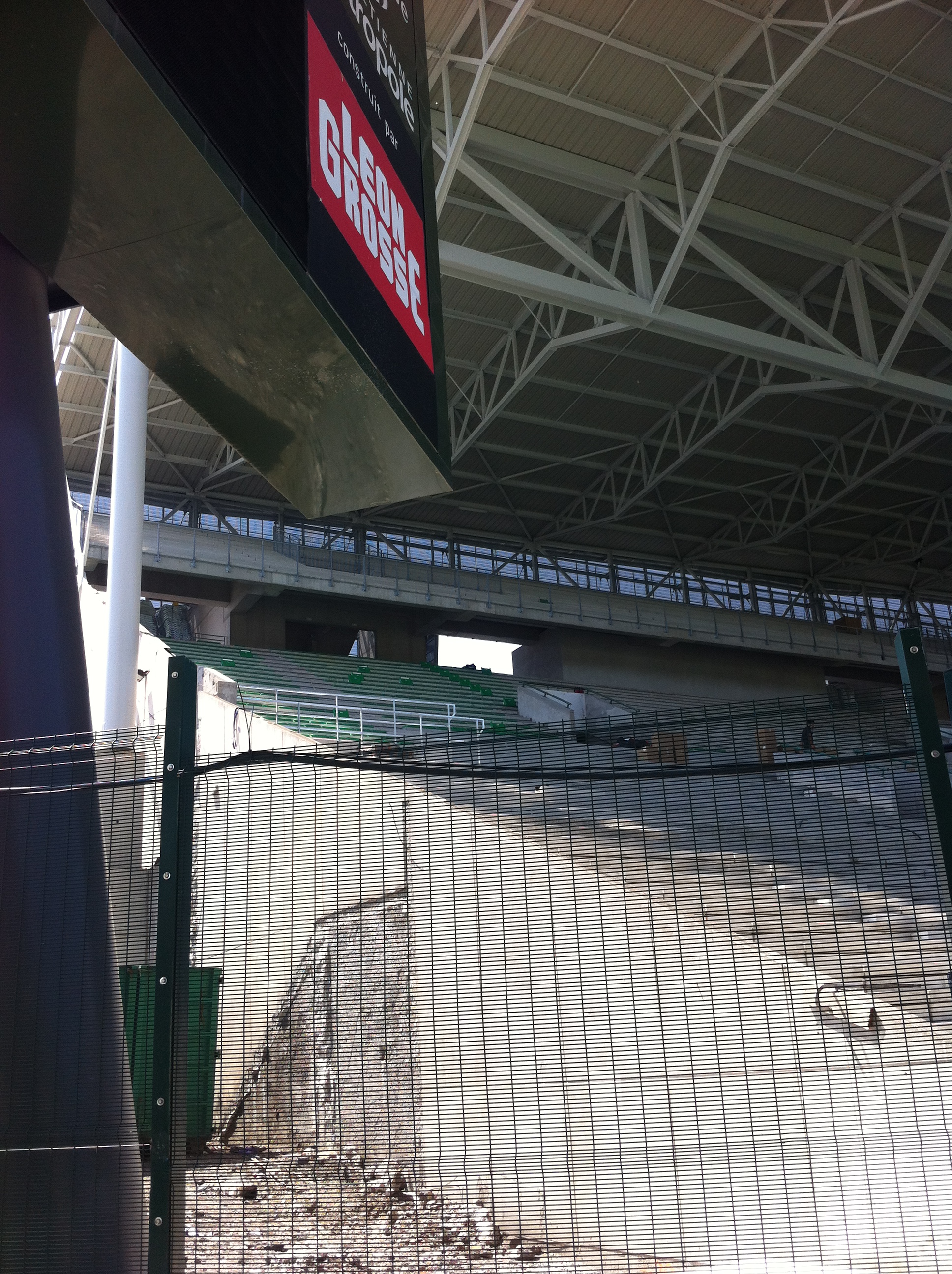 - La tribune visiteur est déjà pas mal abimée (normal on va dire...). Les plexis sont brulées, abimés. Le pire se sont les sièges qui sont très sales. Avec cette dominance de blanc je vous raconte pas. Je n'ose meme pas m'assoir dessus. Espérons qu'ils pensent à les nettoyer car c'est plutot sales. A la fois le dossier et la galette. J'ai touché un dossier blanc, je ne suis pas très optimiste quant à la durée de vie...mais bon