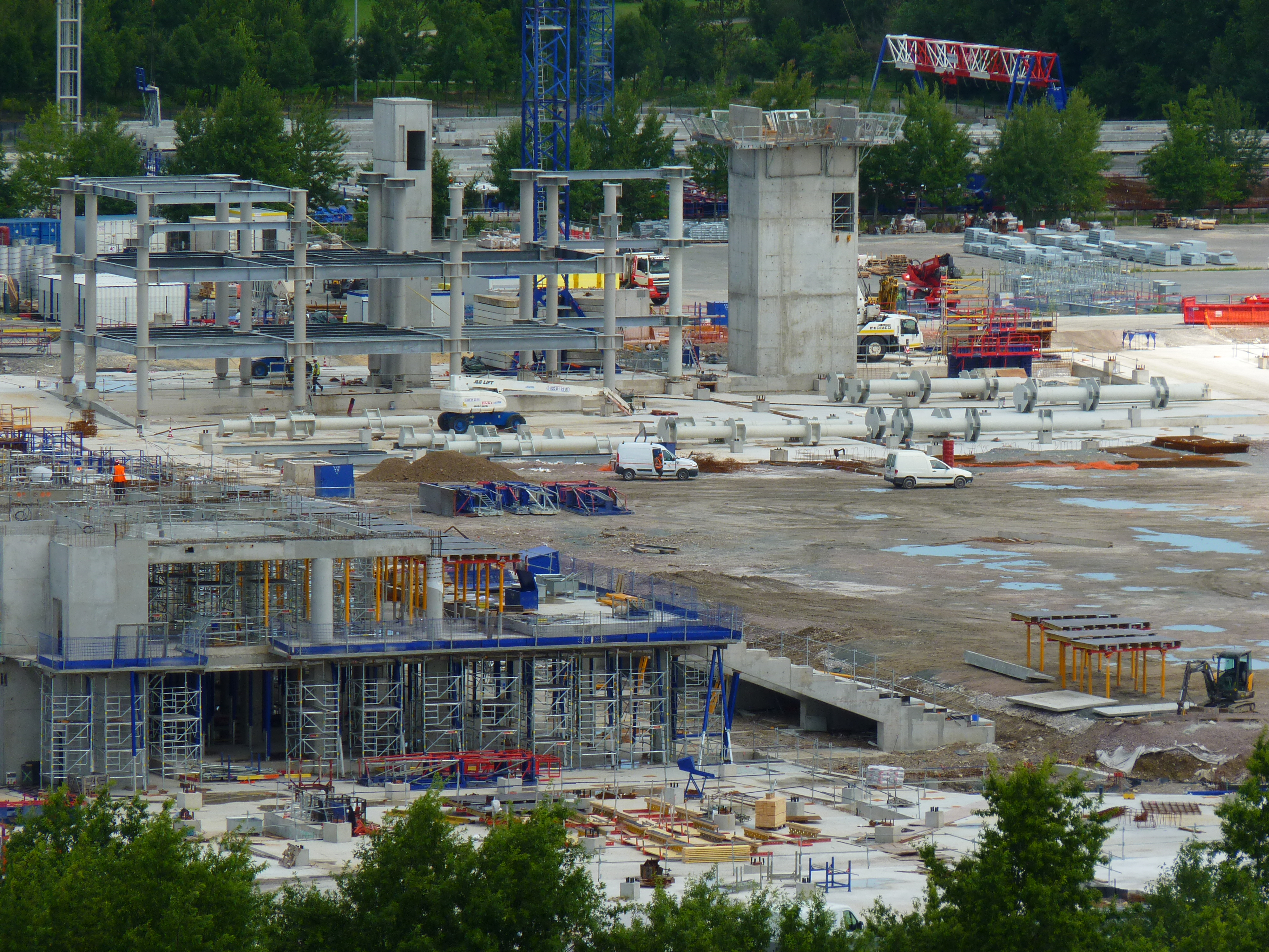 Voici de nouvelles photos prises depuis la tour GAN aujourd'hui, je vous laisse regarder les détails et apprécier l'accélération monstrueuse du chantier depuis la fin juin... Déjà la fin des crémaillères en béton, la charpente métallique au nord et au sud, les niveaux R+2 en tribunes est/ouest, la dalle portée bouclée, ou encore les premiers gradins en place