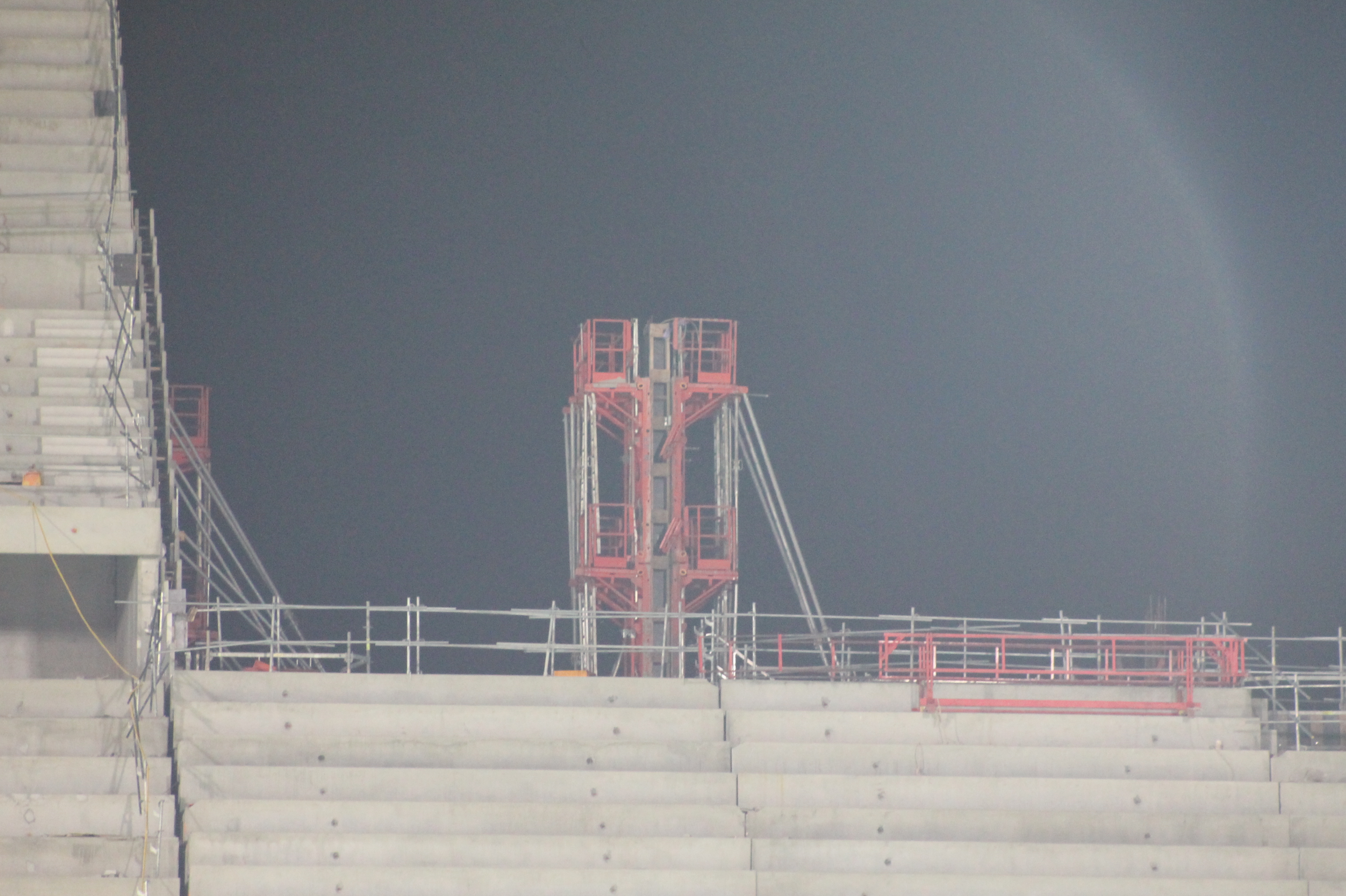 A la vue de cette photo et la présence des petites terminaisons oranges sur les montants verticaux des palées, il ne faut aucun doute que ce sont des palées de soutien interne pour la charpente de JB. Ces palées vont aller dans les gradins de JB et sur les pattes oranges viendront se fixer les bracons gris et orange couchés au sol en bas à gauche de la Velcam (à gauche des morceaux de potelets)