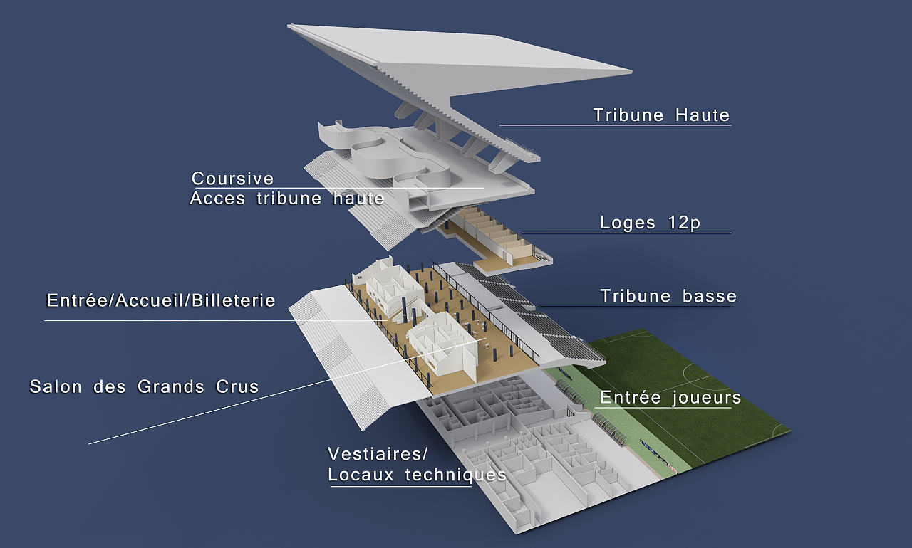 Grand public : tribunes est/ouest (4 escaliers pour chaque tribune vers coursive en R+3)