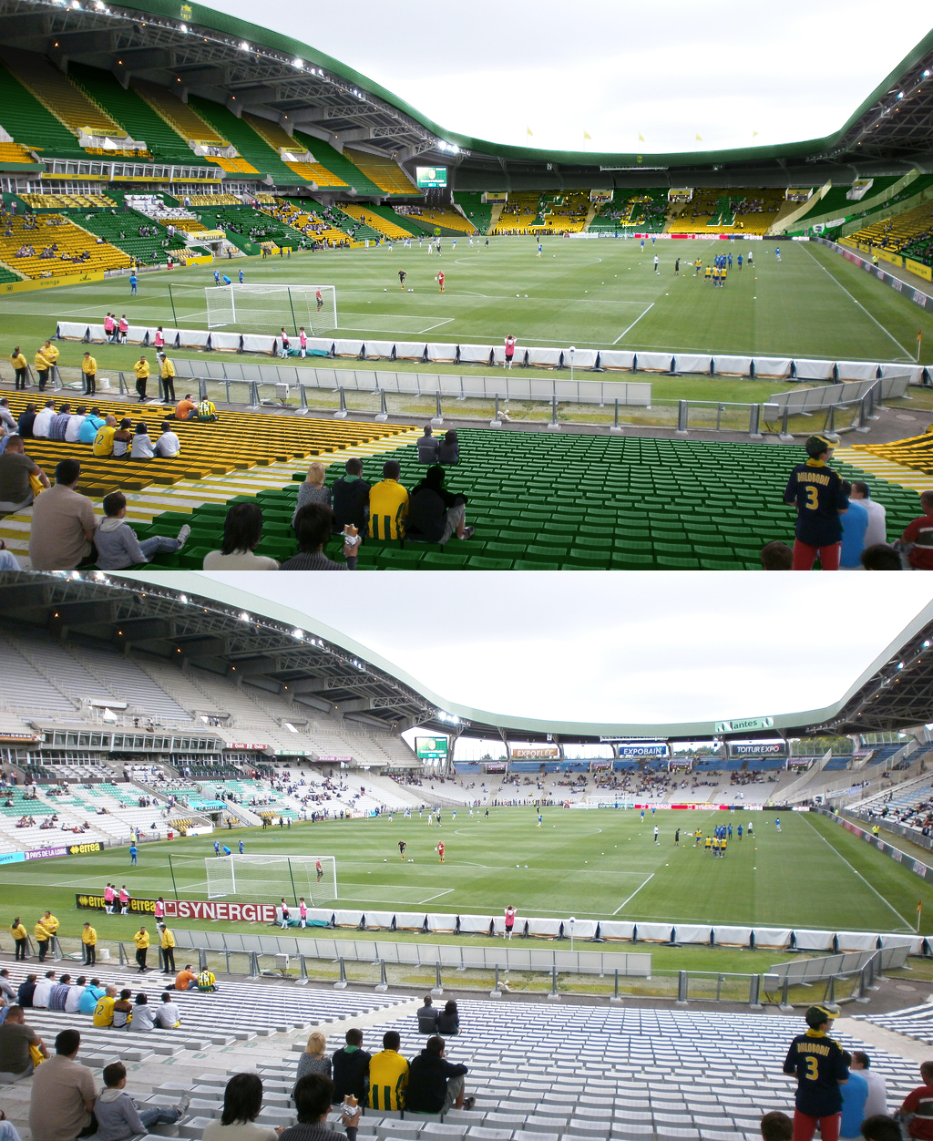 C'était le maillot de Nantes en ligue des champions 2001/2002 pourtant. Le vert fait aussi partie des couleurs du FCN. Mais un maillot entièrement jaune ou à bandes vertes aucun problème. D'ailleurs, à mon avis, le plus beau maillot de Nantes c'était celui avec les bandes jaunes et vertes en 1995. Mais pour les sièges d'un stade ce n'est pas du tout la même chose, esthétiquement je trouve le rendu très moyen. Inférieur à celui du premier montage en tout cas.