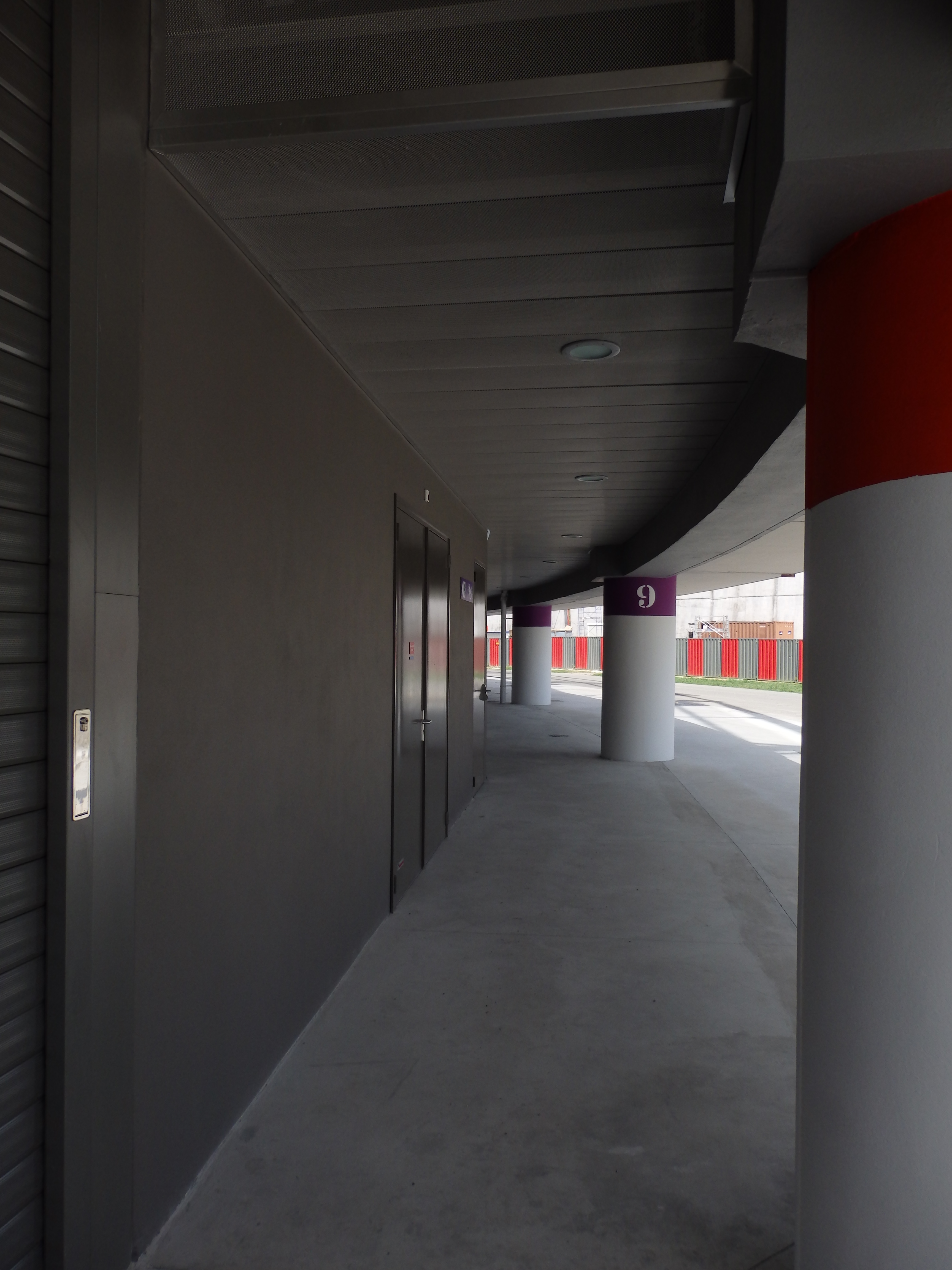 les vomitoires peint en violet, c'est pas mal, ça détonne avec le gris.