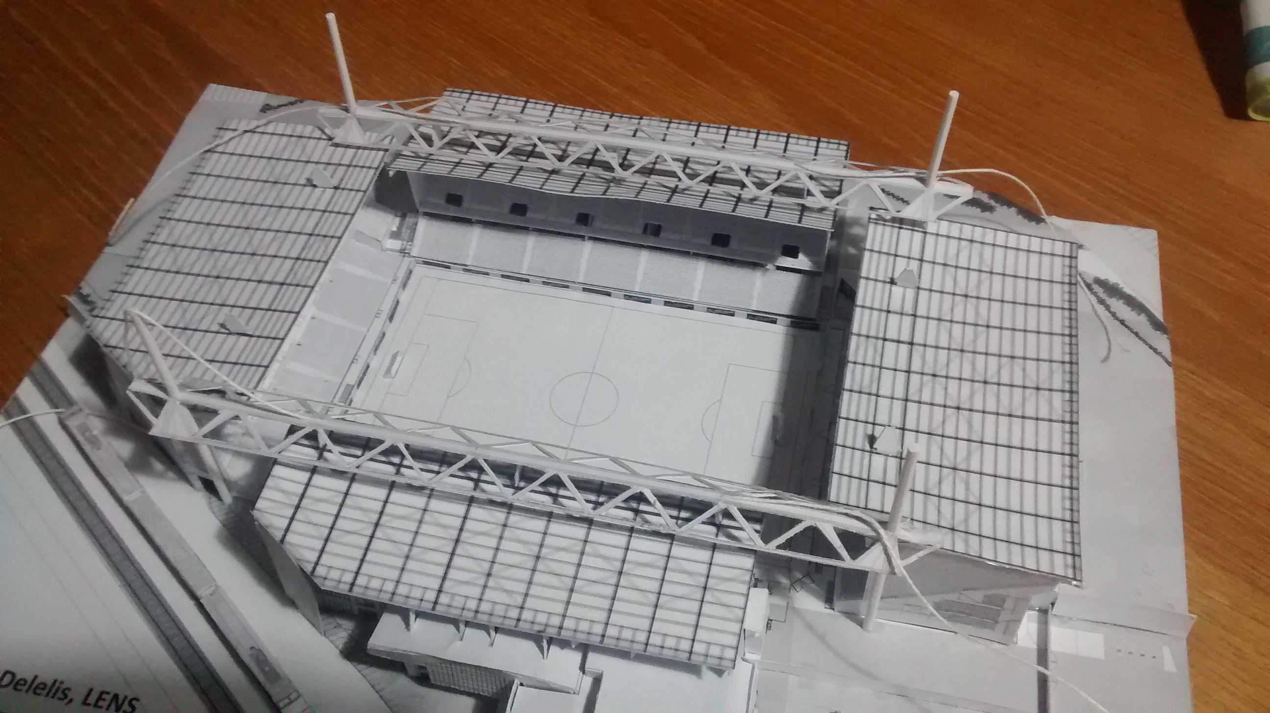 Ma maquette s'achève, la quasi-intégralité des dimensions de ma maquette respecte le 1/750e, excepté les buts (très légèrement augmentés) et les panneaux publicitaires autour du terrain (presque doublé en hauteur)