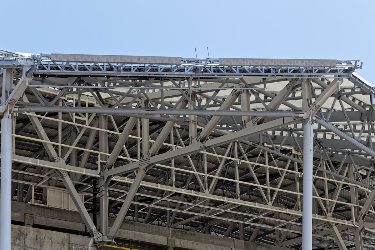 Le bardage verticale a bien débuté en tribune ouest avec la pose dans le prolongement du muret qui se trouve tout en haut de la tribune.