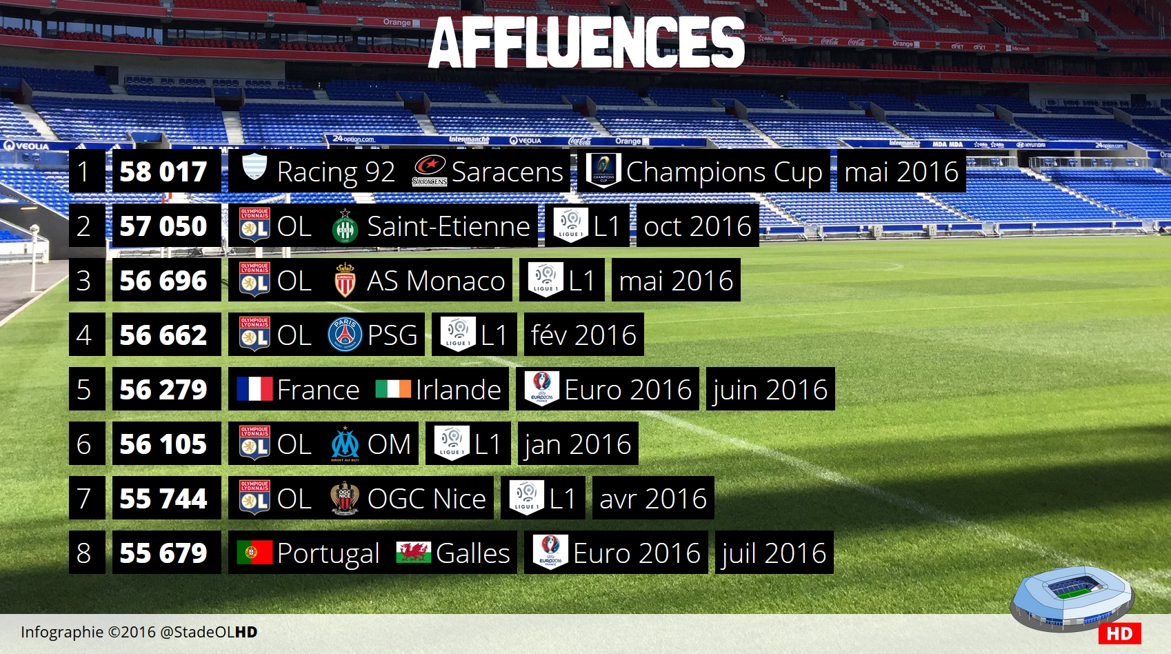 « Pour sa 1ère année de fonctionnement, le Parc OL a connu une année 2016 historique avec une moyenne record pour l’Olympique Lyonnais de 44.500 spectateurs pour les seuls 19 matches de Ligue 1 avec une tarification comparable à celle en vigueur au stade de Gerland notamment pour les places les moins chères (10E pour certains matches au Parc OL contre 16E à Gerland). Il est à noter que sur ces 19 matches, 8 ont réuni plus de 50.000 spectateurs, pour les 6 matches retour 2015-2016 (avec 2 des 3 meilleures affluences de toute la Ligue 1) et 2 pour les matches aller 2016-2017 qui font également partie des 3 meilleures affluences de toute la Ligue 1 (57.050 spectateurs pour le derby et 55.107 pour la venue du PSG) », fait remarquer l’Olympique Lyonnais. A noter toutefois que le record d’affluence au stade du Parc OL est à mettre à l’actif de la finale de la H Cup de rugby entre le Racing 92 et les Saracens le 14 mai dernier qui avait réuni 58.017 spectateurs.