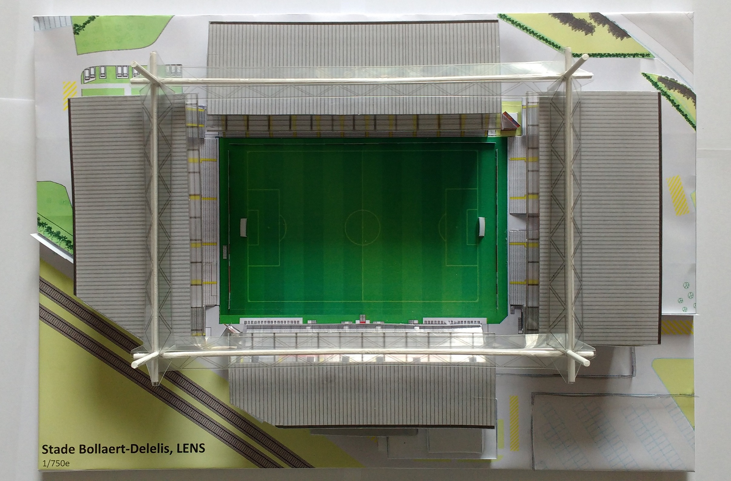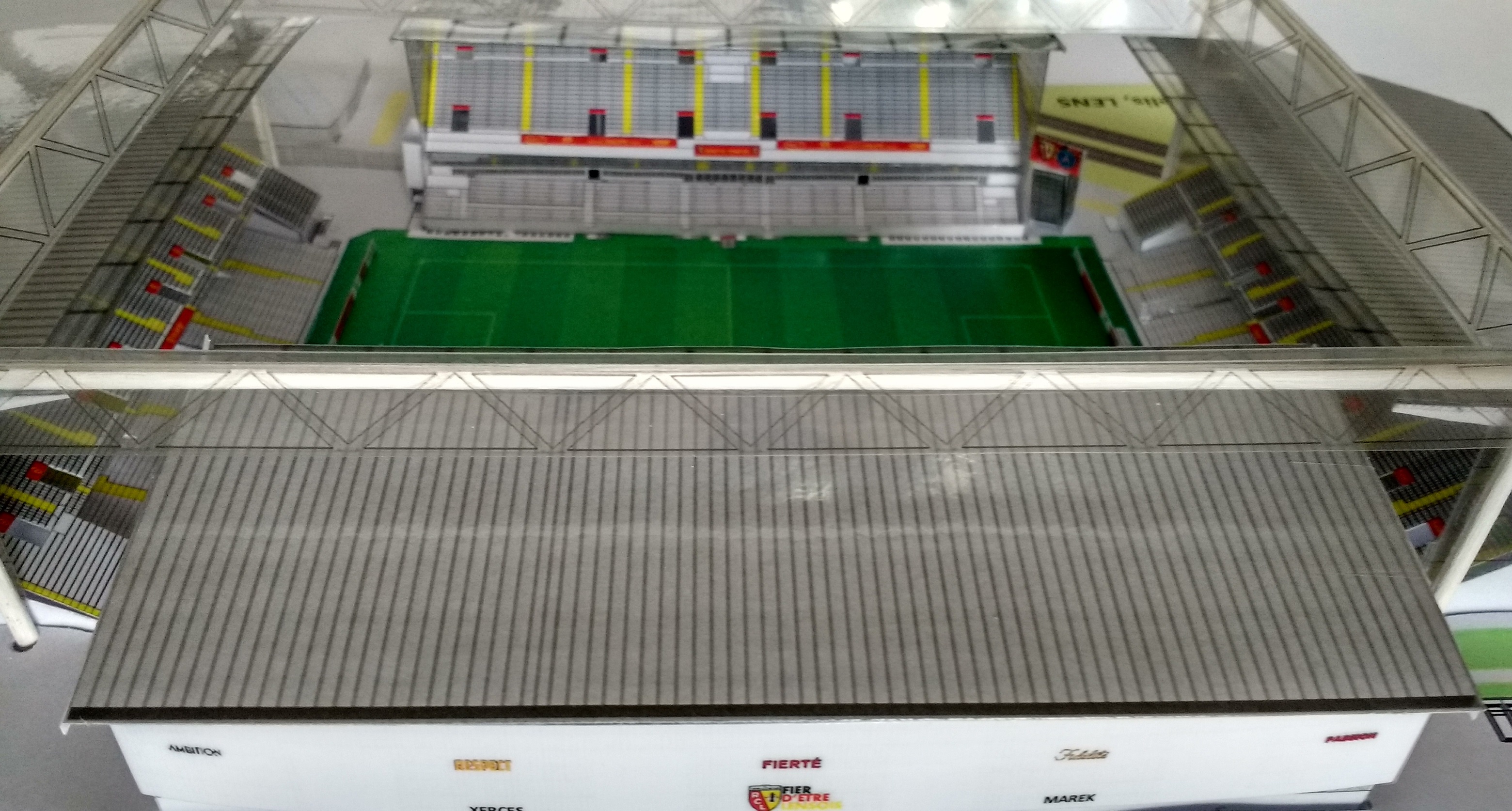 Cette maquette contient tous les détails, reproduit minutieusement, du stade des Sang et Or (buts, panneaux d’affichage, panneaux publicitaires, méga-poteaux et méga-poutres, tour de vidéosurveillance, parcage visiteurs, visages de Félix Bollaert et d'André Delelis sur les murs de la tribune Lepagnot, valeurs du club sur les parois de tribune, nouvelle Marek debout, ...). Les 38 223 places sont représentées.