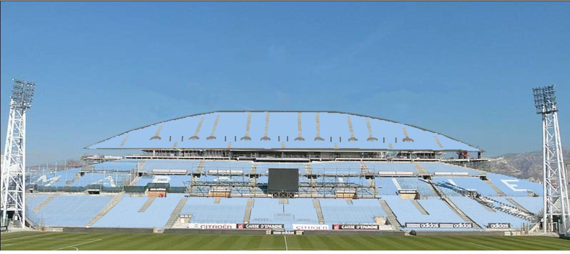 Des sièges tout bleu ciel avec une charpente et une couverture toute blanche à part au dessus du virage sud, où il y aura une goutte d'eau transparente. Et bien sûr les lettres M A R S E I L L E dans les latérales en blancs