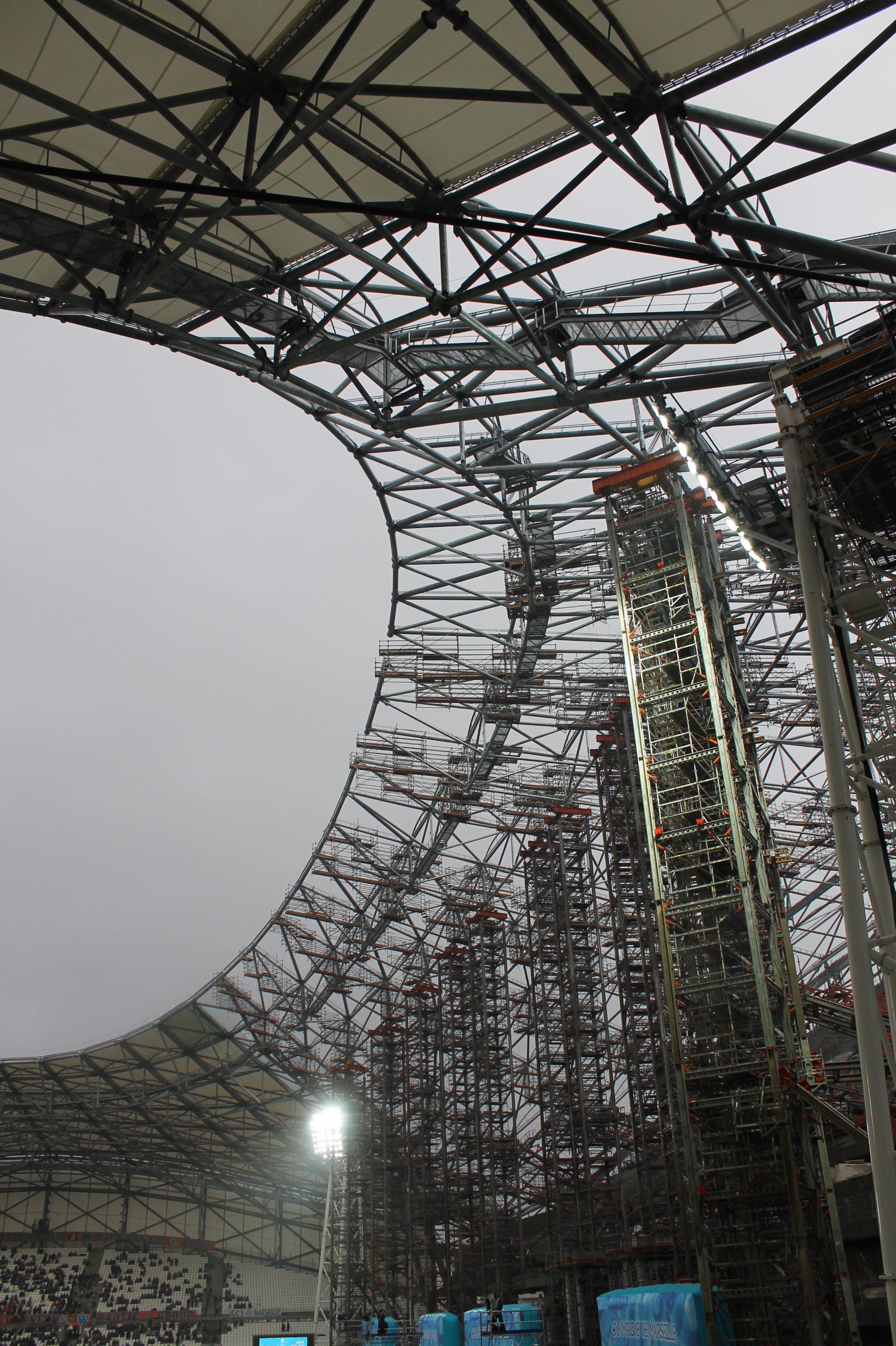 je ne vais pas parler du match ,je suis parti 1/4 d'heure avant la fin,mais j'ai remarqué en arrivant que la toile du toit est arrivee et est stockee a cote de la boutique de l'om dans des caisses en bois venant d'allemagne.