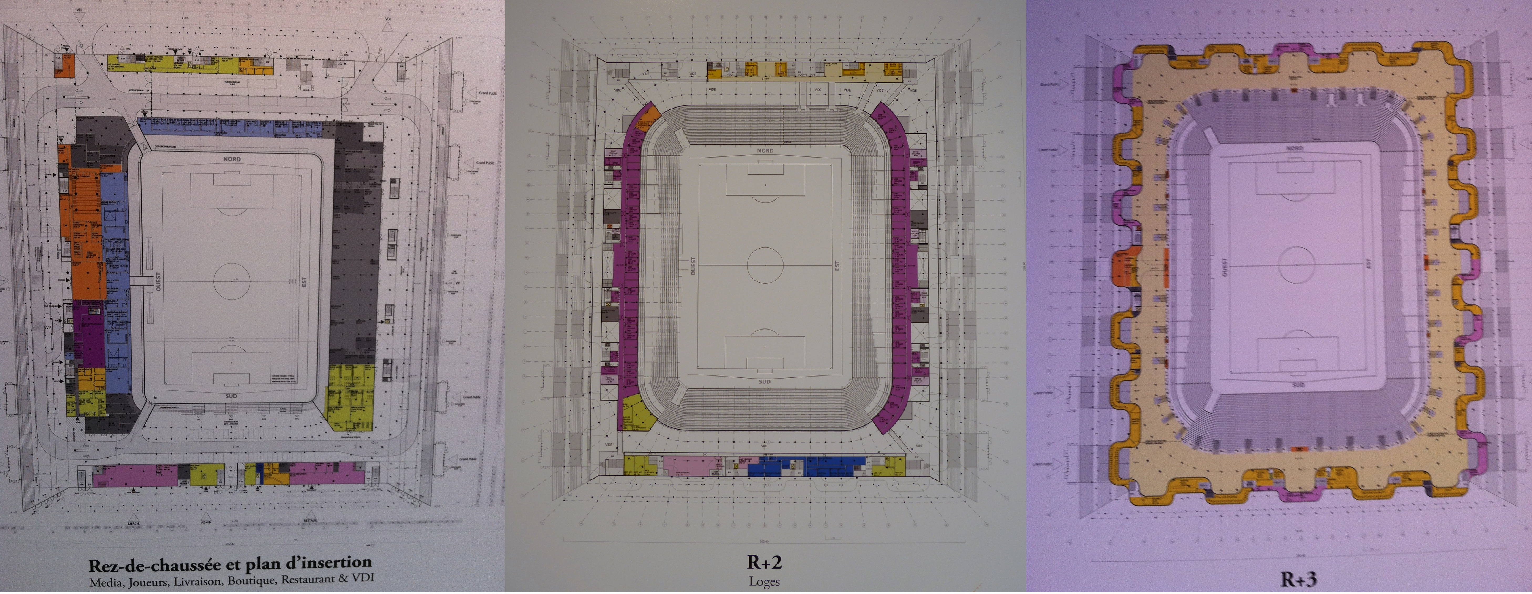 Grand public : tribunes est/ouest (4 escaliers pour chaque tribune vers coursive en R+3)