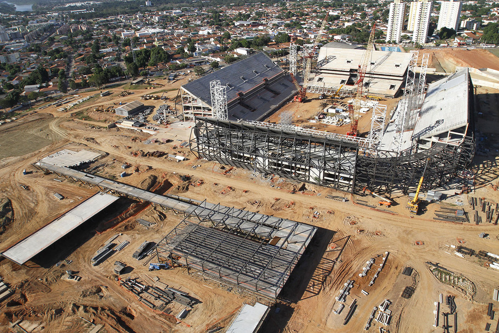On a aussi le stade du Palmeiras à São Paulo, en cours de construction, qui est assez curieux et original puisque sur un côté en arrière des buts les gradins suivent une forme ovale et de l'autre cotê les gradins suivent de plus près les lignes de touche, comme les exemples que je viens de citer..