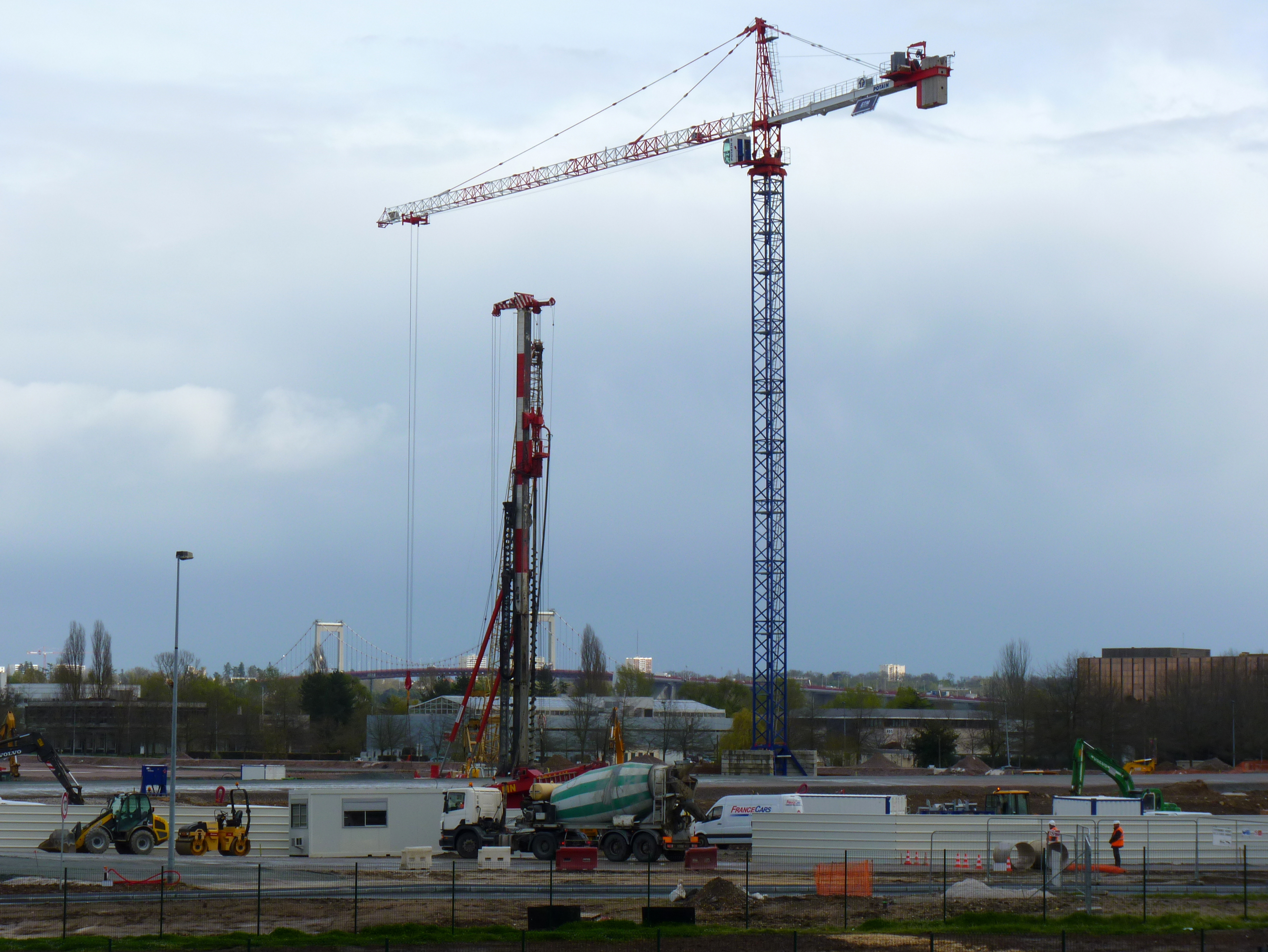 - Les pieux avancent, 3 foreuses sont sur le site depuis 2 semaines, les grues jaunes/bleues s'occupent d'insérer les tiges d'acier entrelacées.