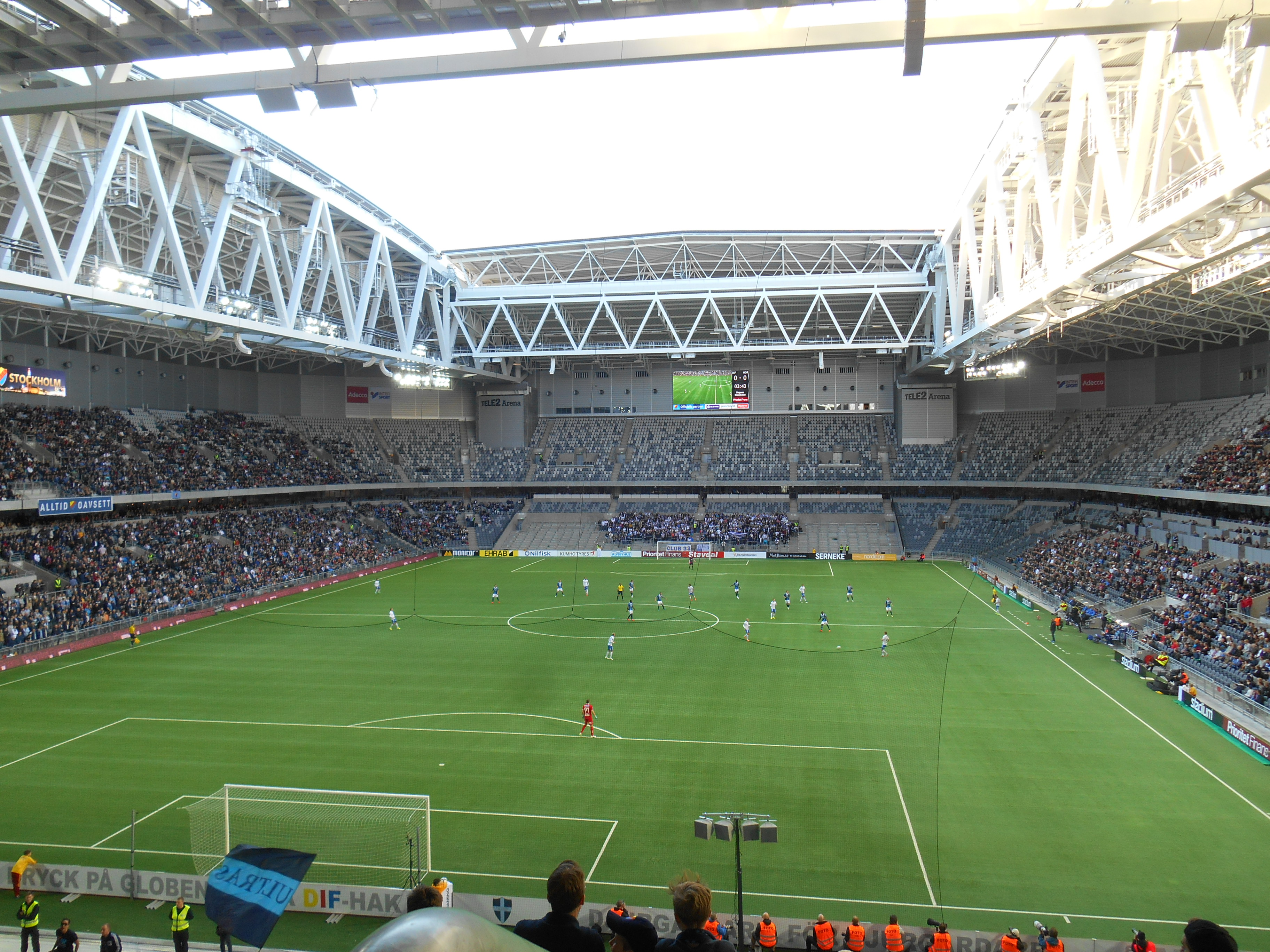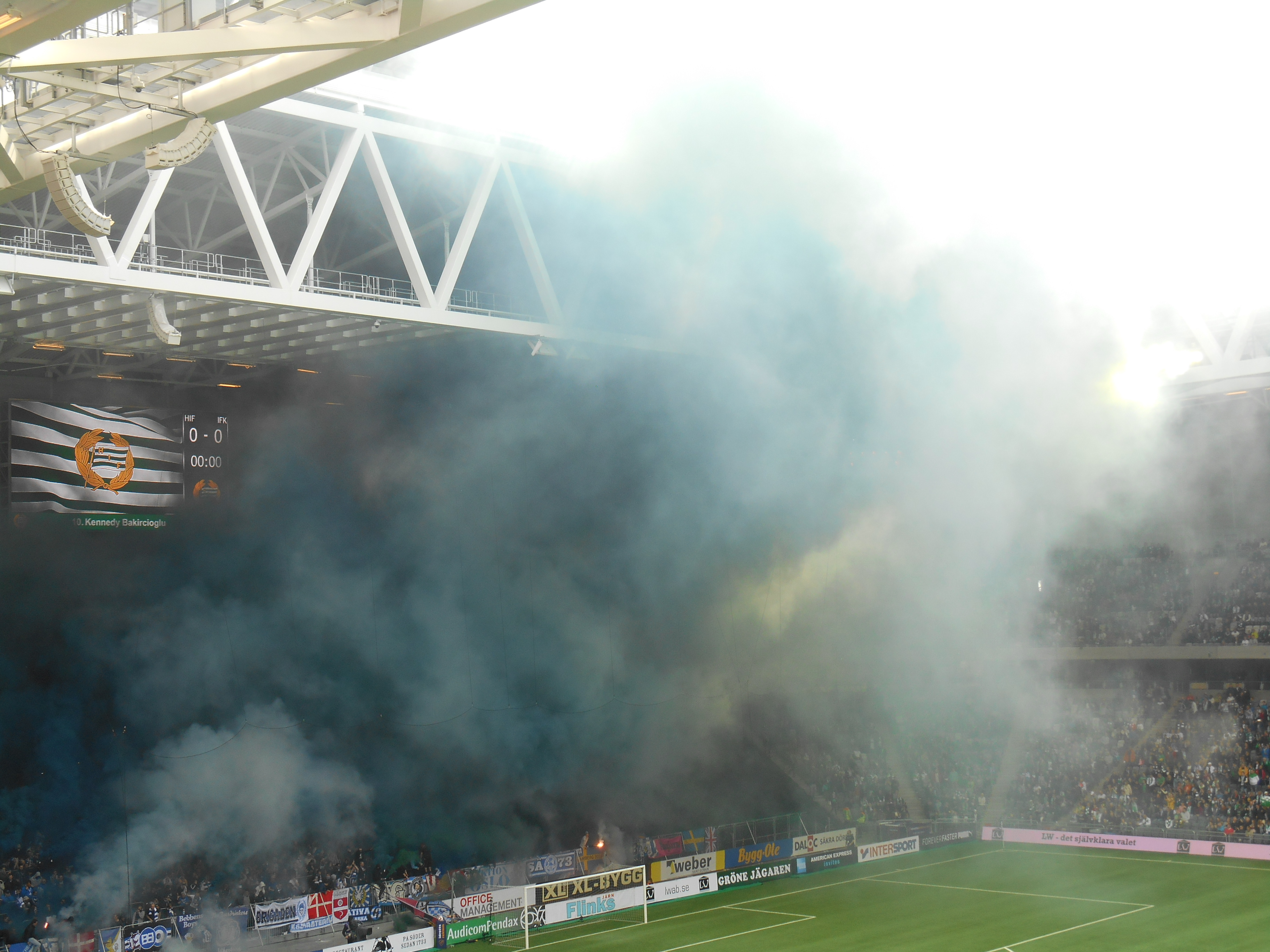 Les fans affluent quasiment tous dans le dernier quart d'heure. Très peu de chants ni de sifflets en avant match. Mais lorsque le "Capo" lance la tribune, la caisse de résonance est impressionnante. Le kop est quasi plein, et au moment du coup d'envoi, seul la tribune visiteur est vide. Sur environ 30 000 places, quasiment 18 000 personnes ont pris place dans le stade. Belle surprise. Niveau chants, le répertoire semble large et bien que je ne comprenne rien à la langue Suèdoise, quelques chants sont similaires à ce que l'on peut entendre partout en définitive... si ce n'est quelques poussées mémorables bien de chez eux, avant et après le but des locaux. Le nom "Ultras" n'est alors pas usurpé lorsque l'on chante durant 90 minutes et que l'on accompagne les attaques de son équipe.