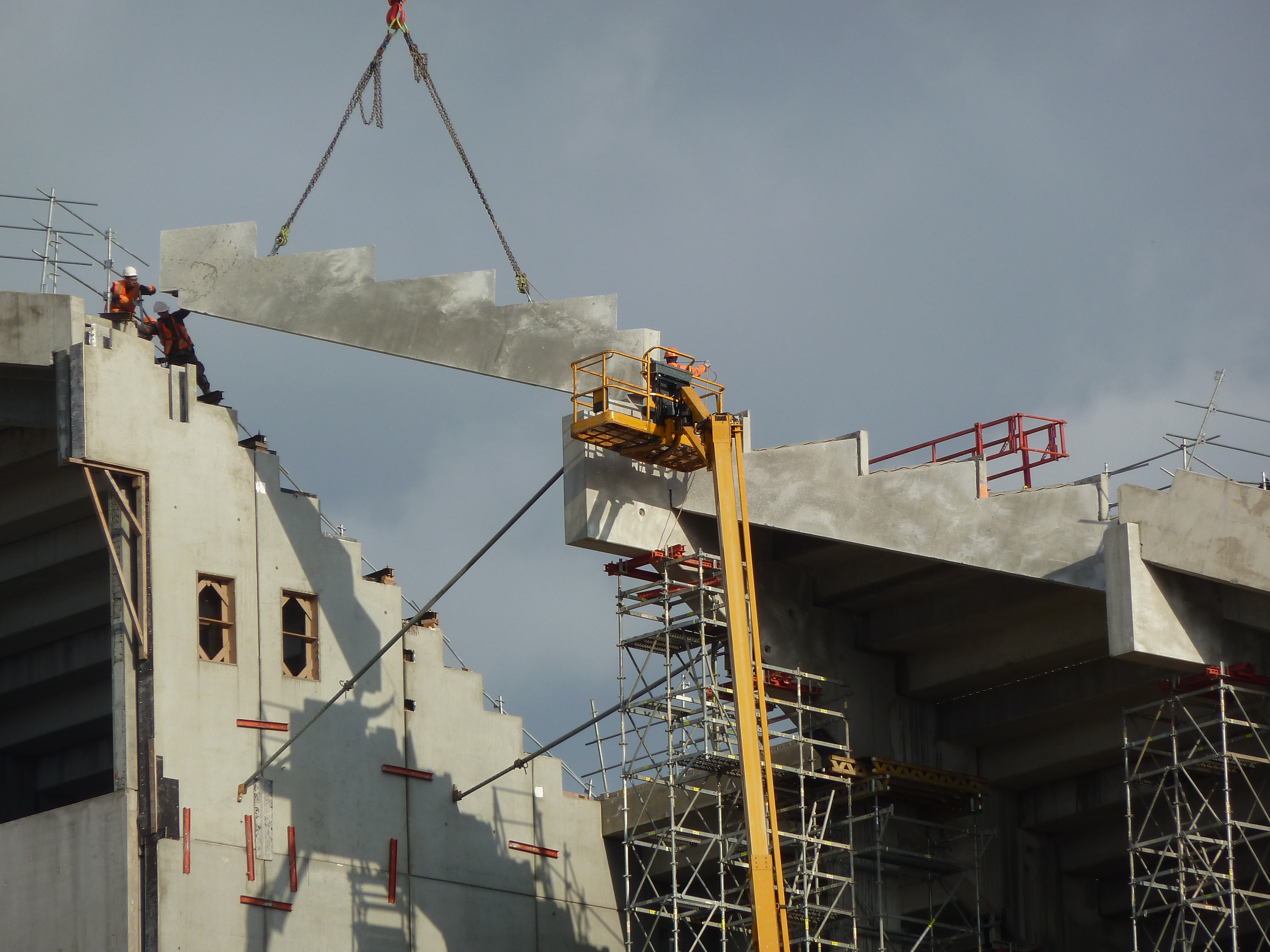 Cette partie de tribune est vraiment intrigante avec ce mur qui dépasse bizarrement. A cet endroit là, le toit sera sans doute plus éloigné des gradins que vers le centre de JB, ou bien?