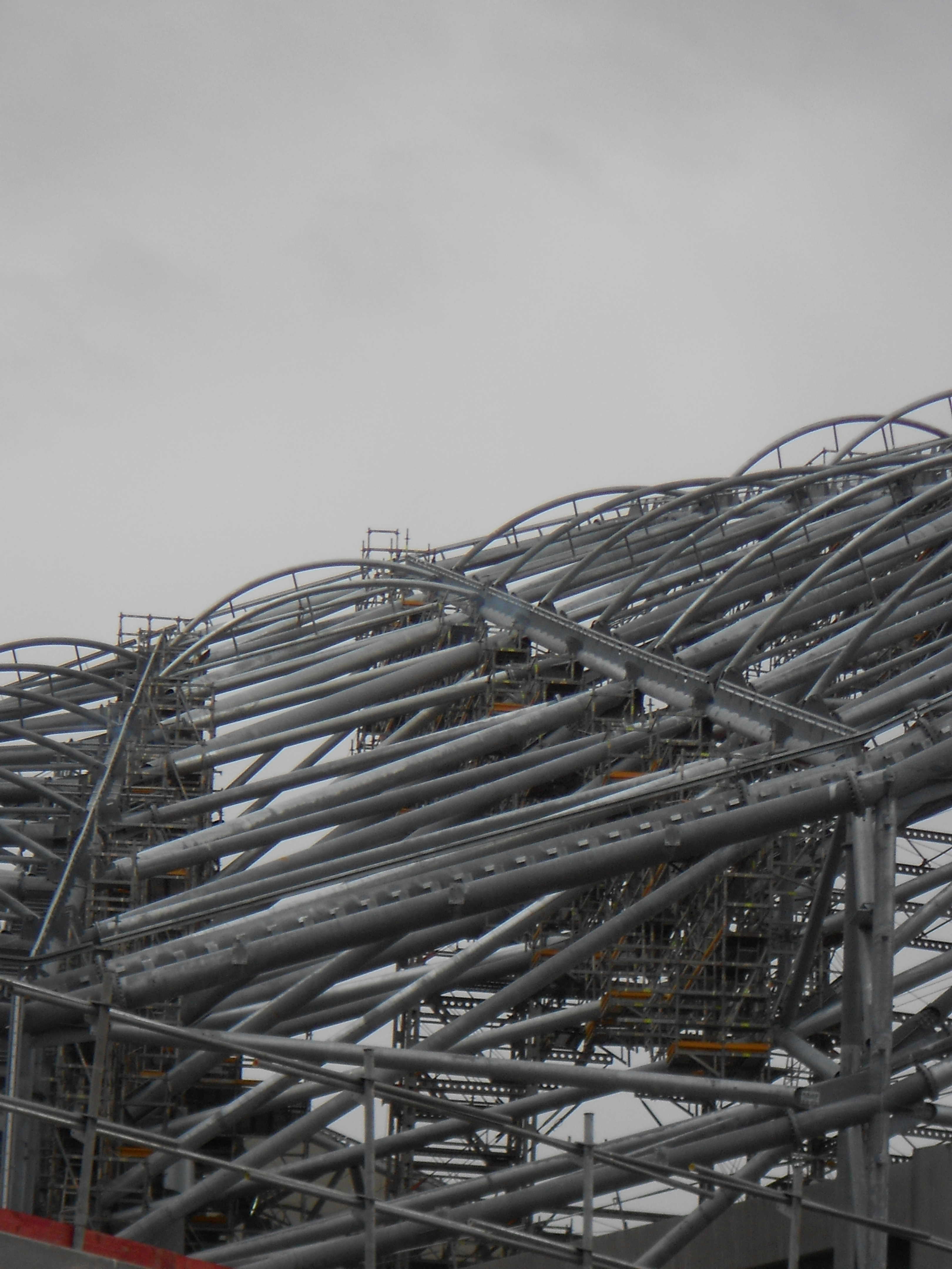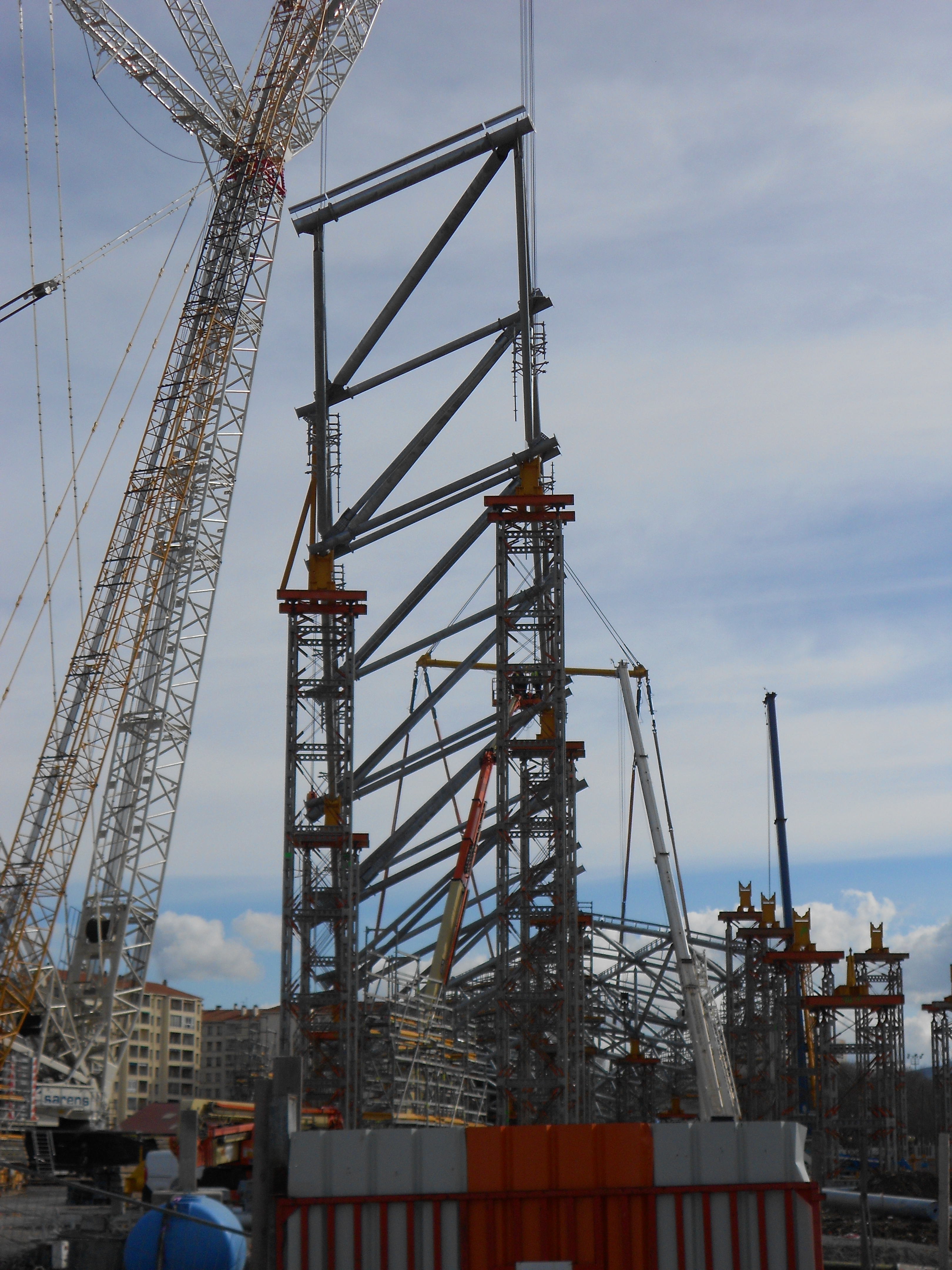 La grue mobile à l'intérieur du stade s'occupe d'échaffaudage sur le deuxième colis simple coté centre, elle prepare déjà la jonction avec le colis double
