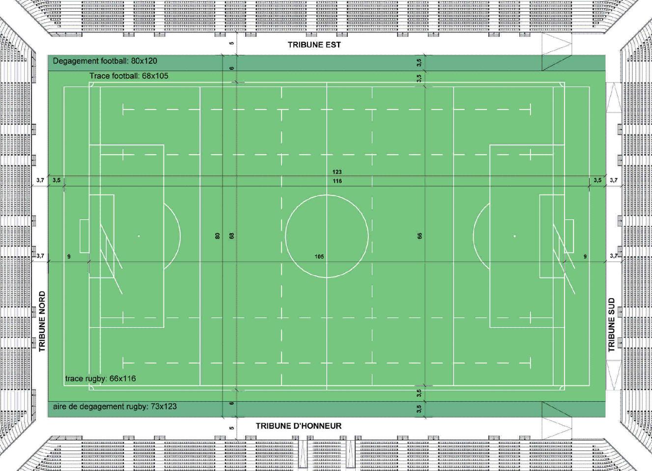 Les distances telles que définies dans le dossier d'EIFFAGE :Rémi a écrit :Combien de mètres sépareront les 1er spectateurs en bas des tribunes de la pelouse ?