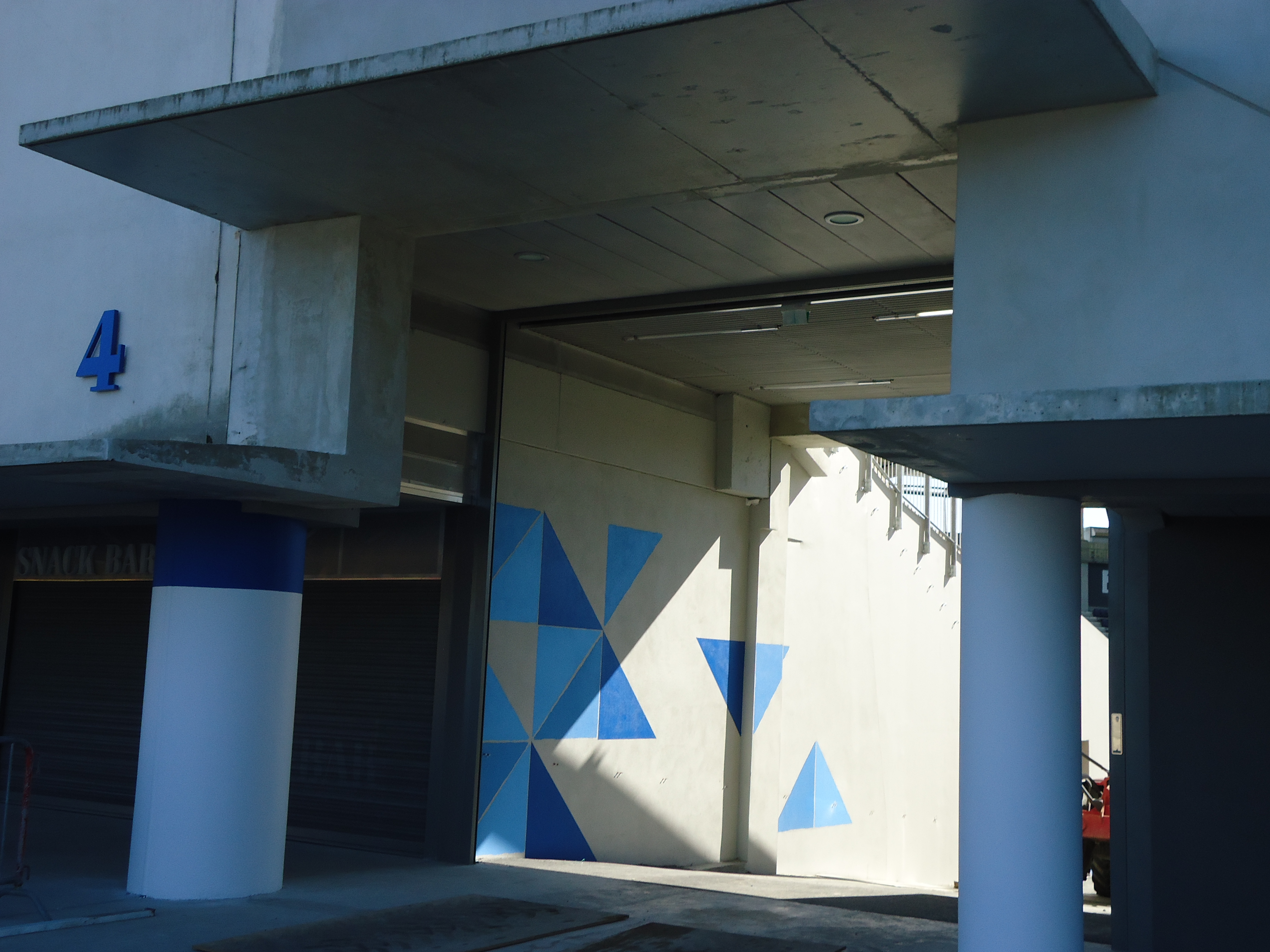 - On peut légèrement apercevoir la pose des sièges en virage Est grâce à la récente ouverture dans le mur de la façade ouest, visible depuis le pont, et seulement sous un certain angle.