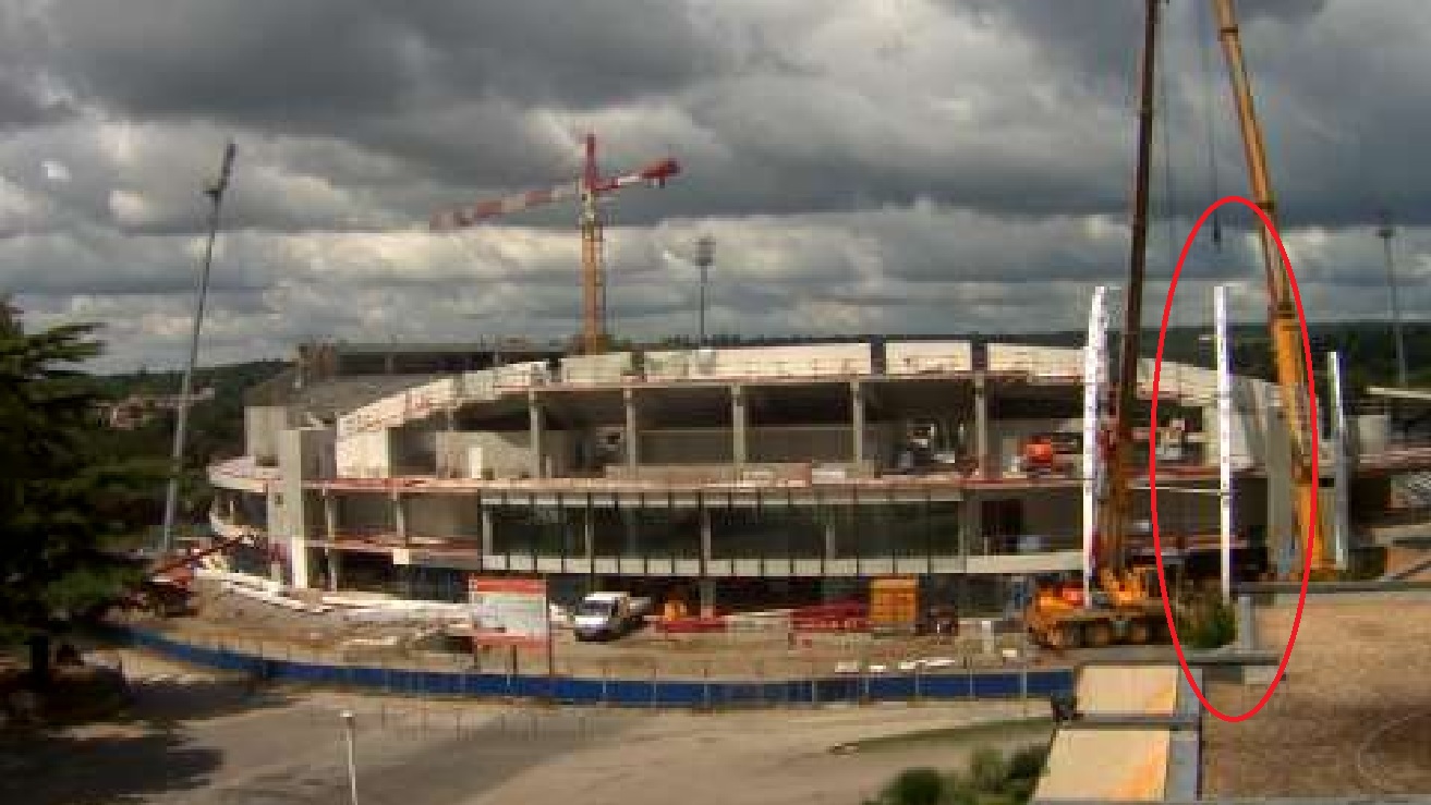 Une des 3 grues est en train d'être démontée (celle du virage côté Palais des Sports) => fin du gros oeuvre.