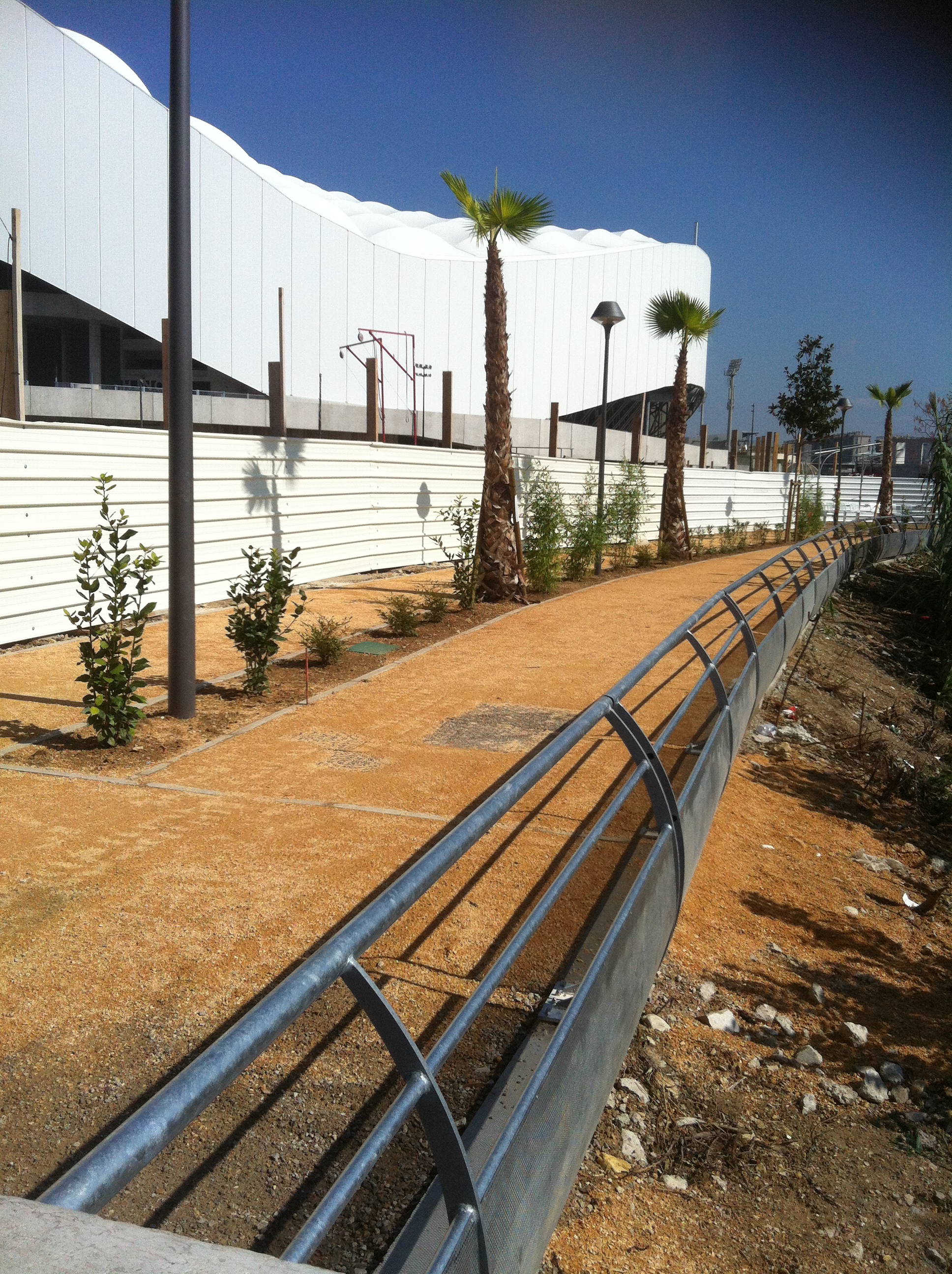 Bon ben pour faire patienter une petite photo, prise hier midi, de la promenade le long de l'huveaune à son arrivée au niveau de michelet Au passage, au niveau de la billeterie JB l'intérieur avance bien : de loin on dirait que plafond, mur, carrelage, banque d'accueil étaient fini. Cette dernière servait de support aux ouvriers pour un petit déjeuner improvisé.