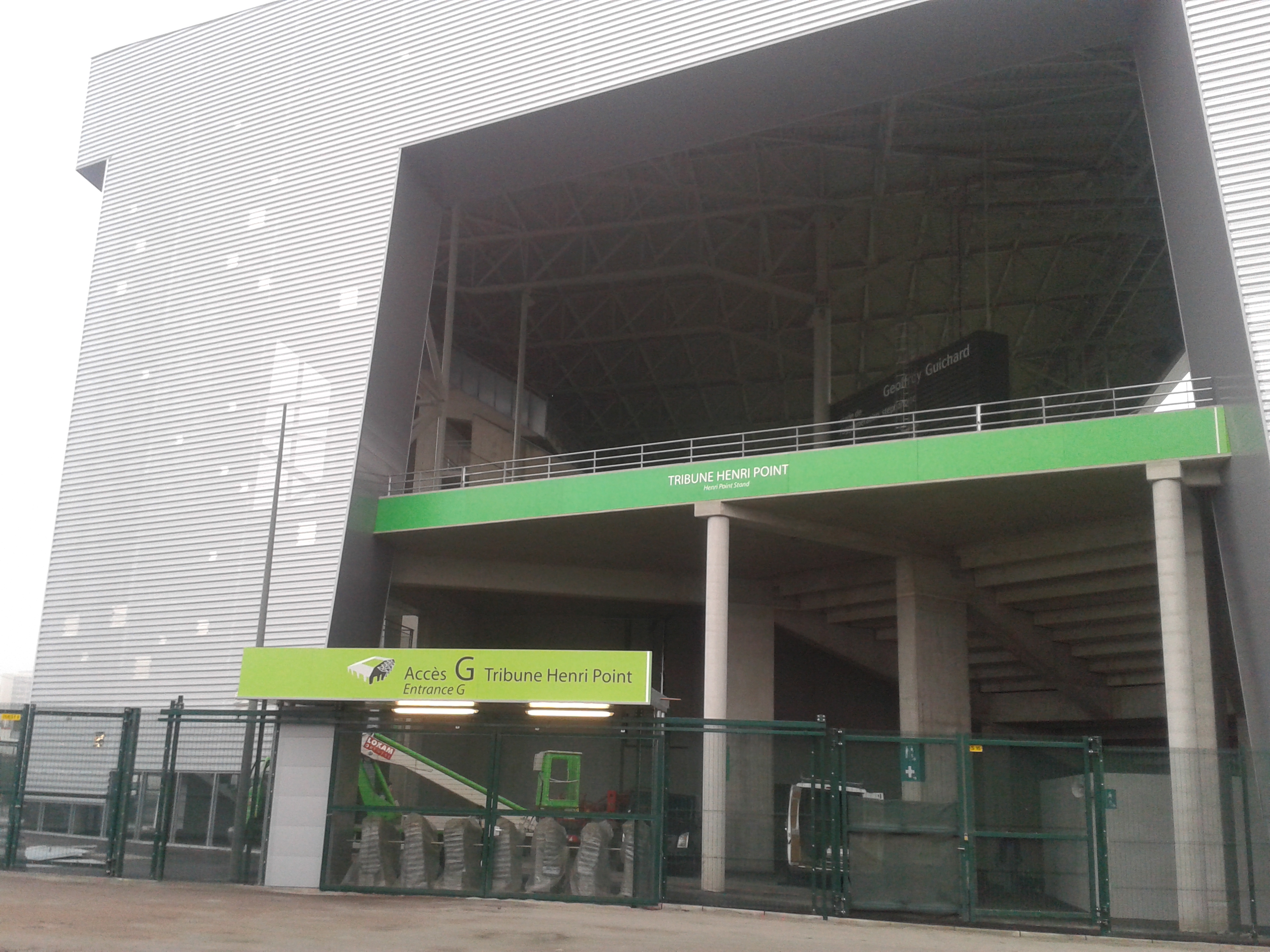 les travaux sur le site du stade Geoffroy Guichard, on peut lire dans la tribune "visiteurs"