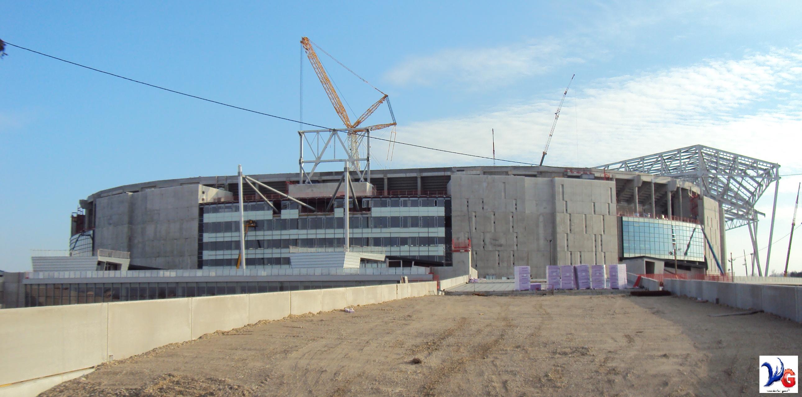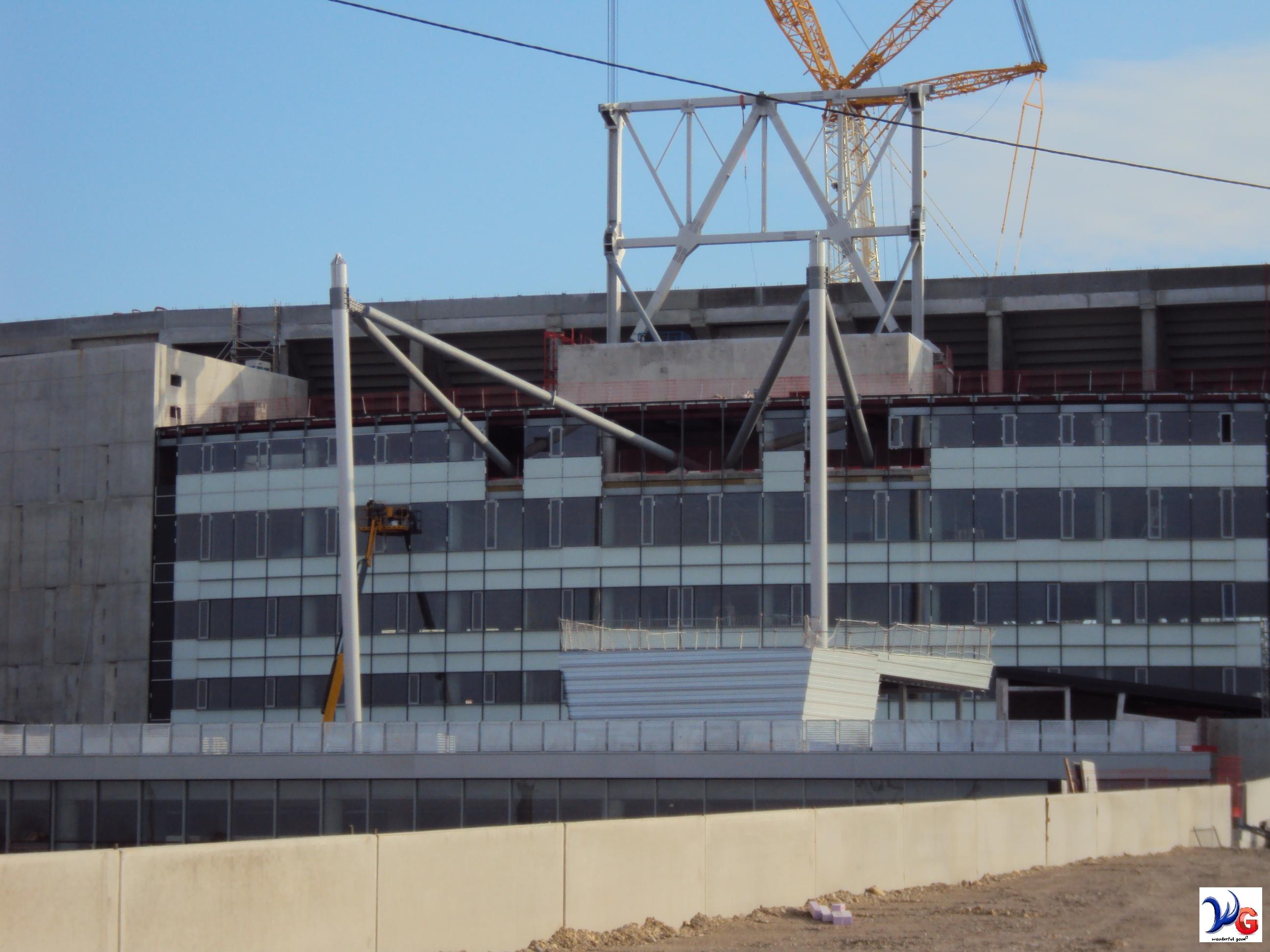 - le vitrage sous les salons, au niveau du parvis (dans chaque quart du stade) ont l'air d'être posés en retrait (derrière une 1ère rangée de poteau) et non dans la continuité des vitrages supérieurs...