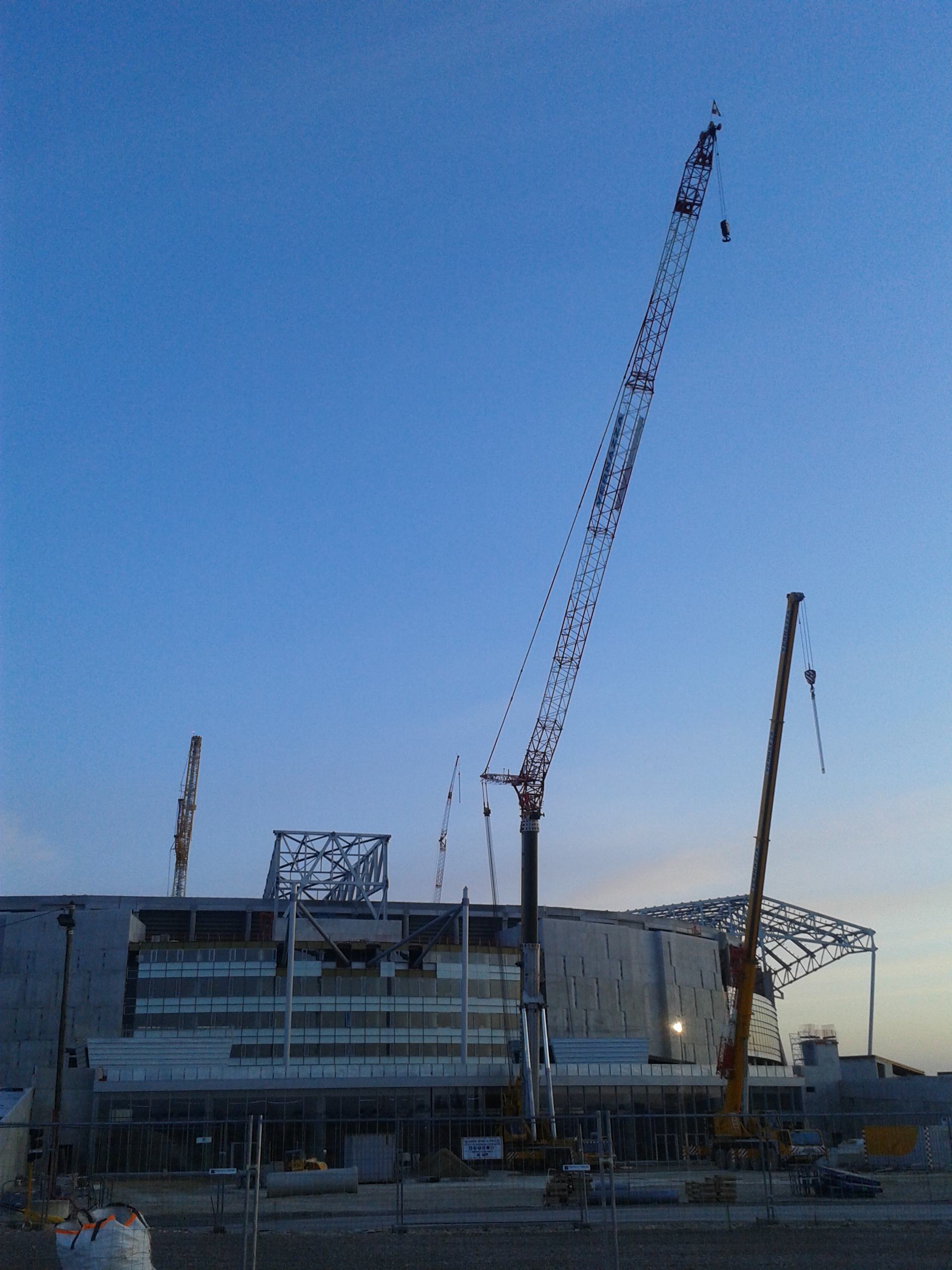 C'est une grue mobile à très fort tonnage (genre 500 tonnes !) pour pour les éléments externes, ça doit aller : le porte à faux sera beaucoup moins important qu'avec la Terex, ce qui fait qu'à la fin, les capacité sont proches (la capacité max de levage étant rapporté à porté max de levage).Buzz l'éclair a écrit :Peut-être qu'elle aidera pour les fléaux extérieurs, même si à première vue elle me paraît bien légère comparée à la grue à l'intérieur du stade.Rom34480 a écrit :la grue a gauche s"allonge de plus en plus, elle va servir au levage des pièce de la charpente ou pas