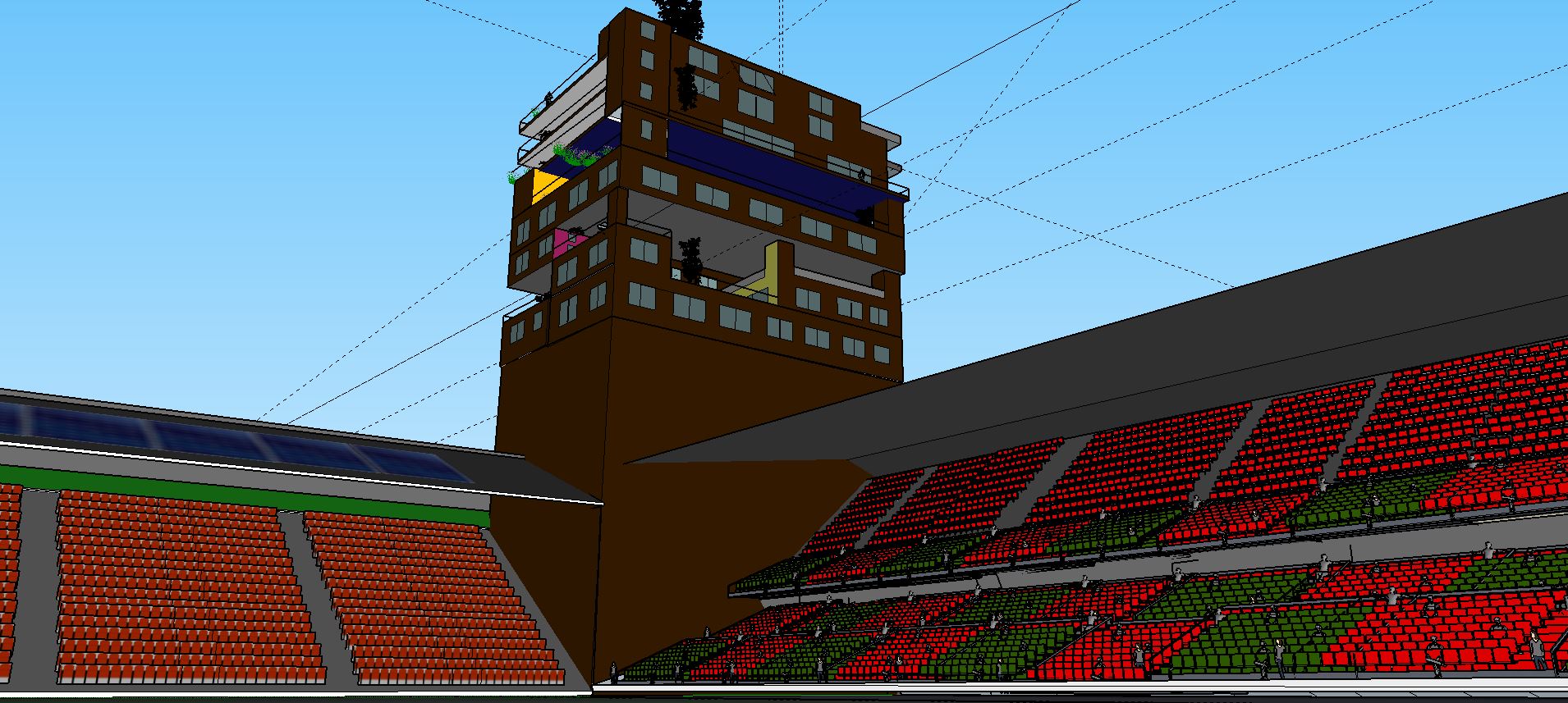 Objectif 3 Créer des logements J'ai lu que l'un des problèmes à la conservation du site actuel était l'appétit des promoteurs auquel pourrait céder la mairie. Dès lors, pourquoi ne pas créer un stade et des logements... Solution : les tours d'angle. J'en ai dessiné 4. les hauteurs restent à définir. Là seule qui est travaillée mesure 56 mètres : des bureaux à la base ( fenêtres pas terminées) et des logements pour la partie supérieure.Habillage bois ?