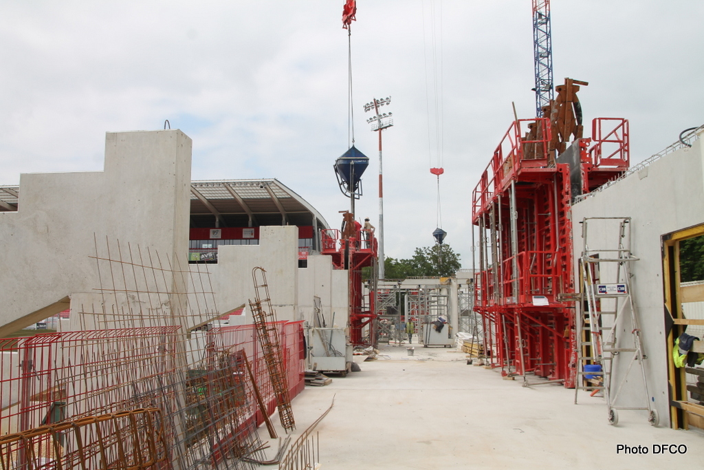 Lorsque le DFCO était en Ligue 1 la capacité du stade était plus importante (16098) il fallait donc plus de 600 places pour les visiteurs (tribune visiteurs actuellement) pour respecter le quota Ligue 1. La tribune visiteur était donc plus importante comme tu peux le voir sur la photo. Lorsque Dijon est redescendu en L2 la mairie n'a pas voulu (ni le DFCO) refaire une commande de sièges.