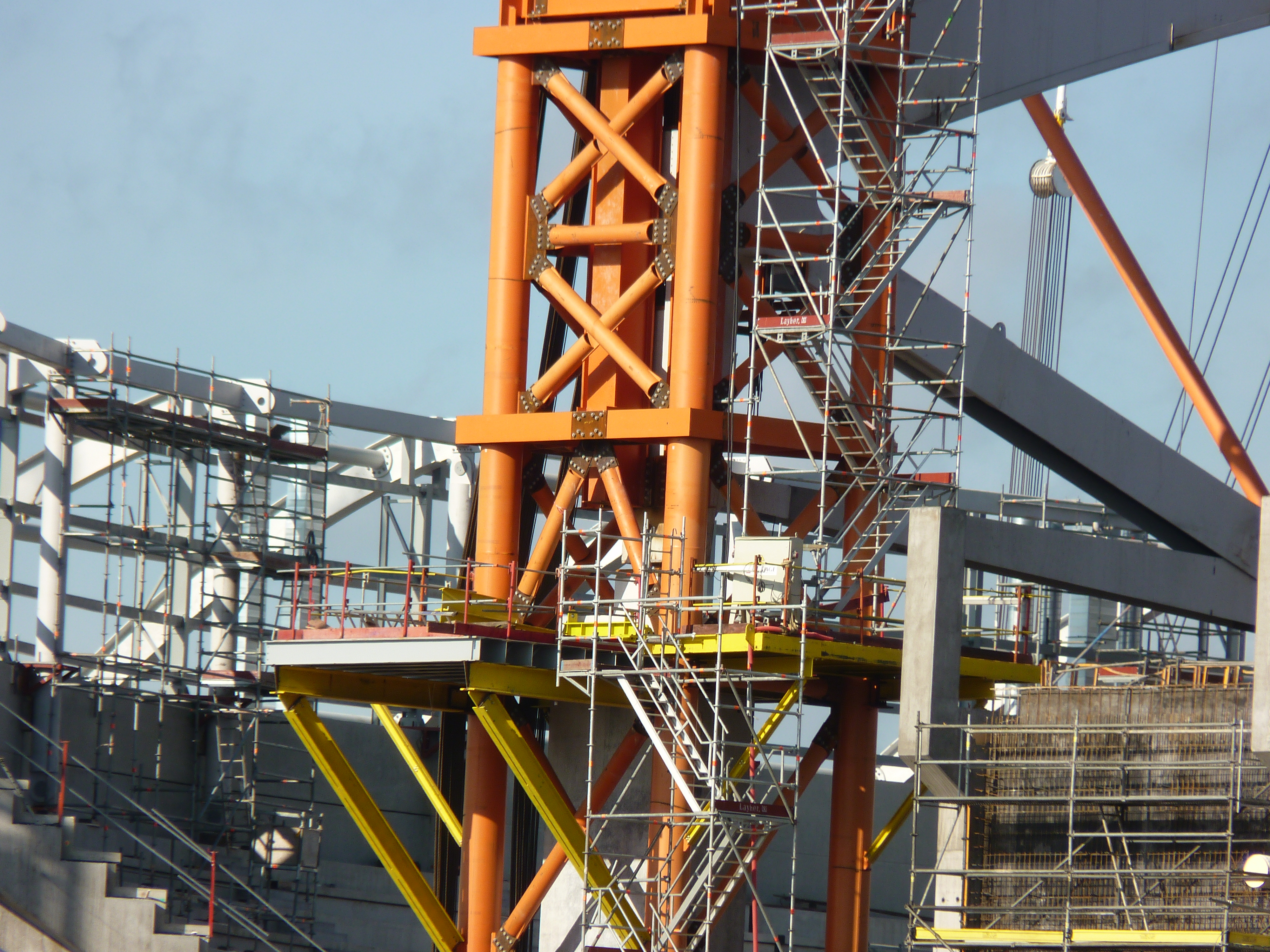 Mais quand on regarde les films de présentation du stade, on voit que les structure métalliques (je ne parle pas des extérieurs) fléaux et arches sont dans le même prolongement... Honnêtement, je ne vois pas trop le truc, là... Peut-êre que lors de la redescende du toit, les arches seront alors fixé aux fléaux en leur "tirant" dessus...