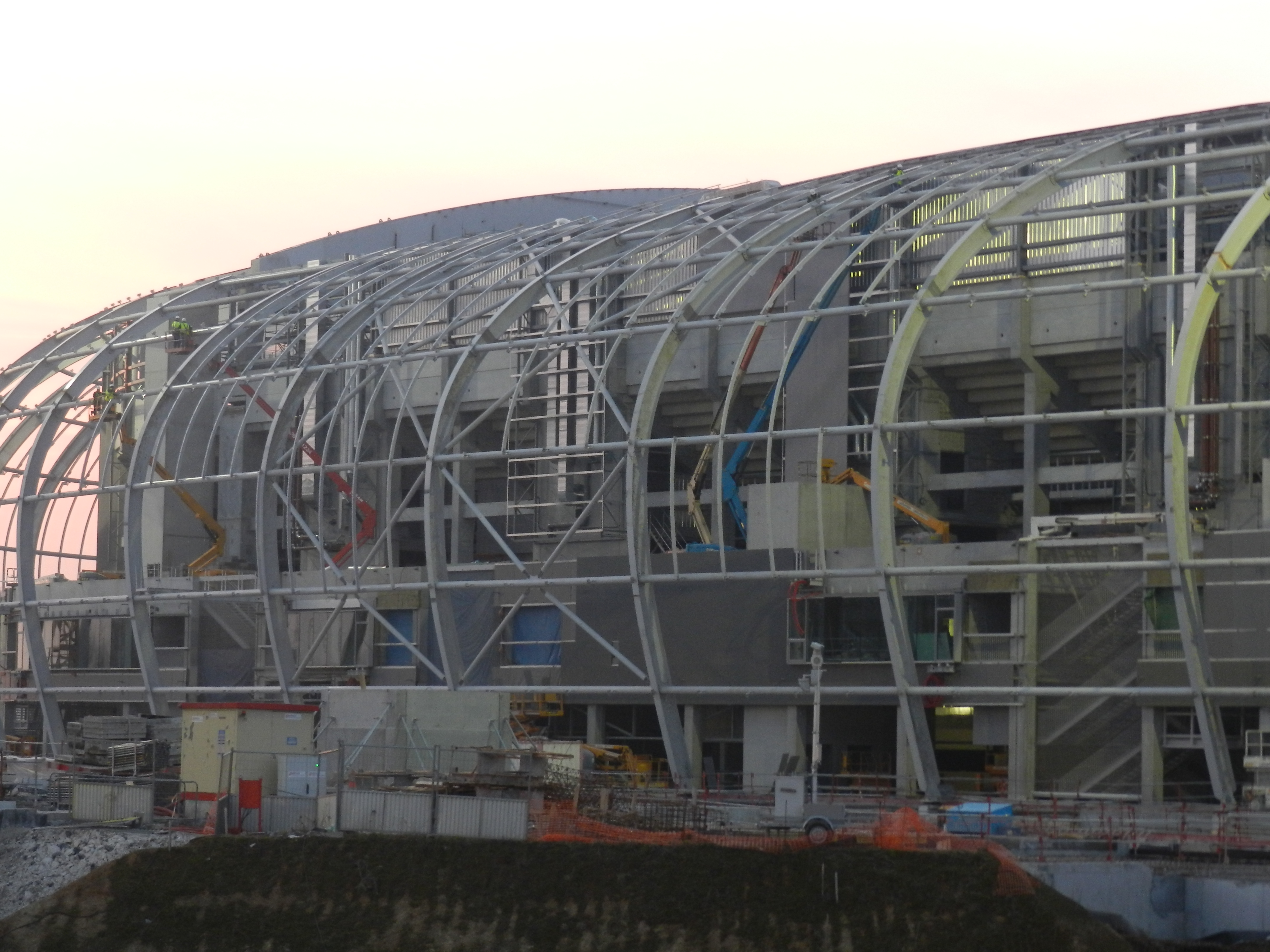 ça y est, ils ont commencé à démonter les tubes oranges supportant au début la toiture en attendant de finir de la pose des arches hautes.
