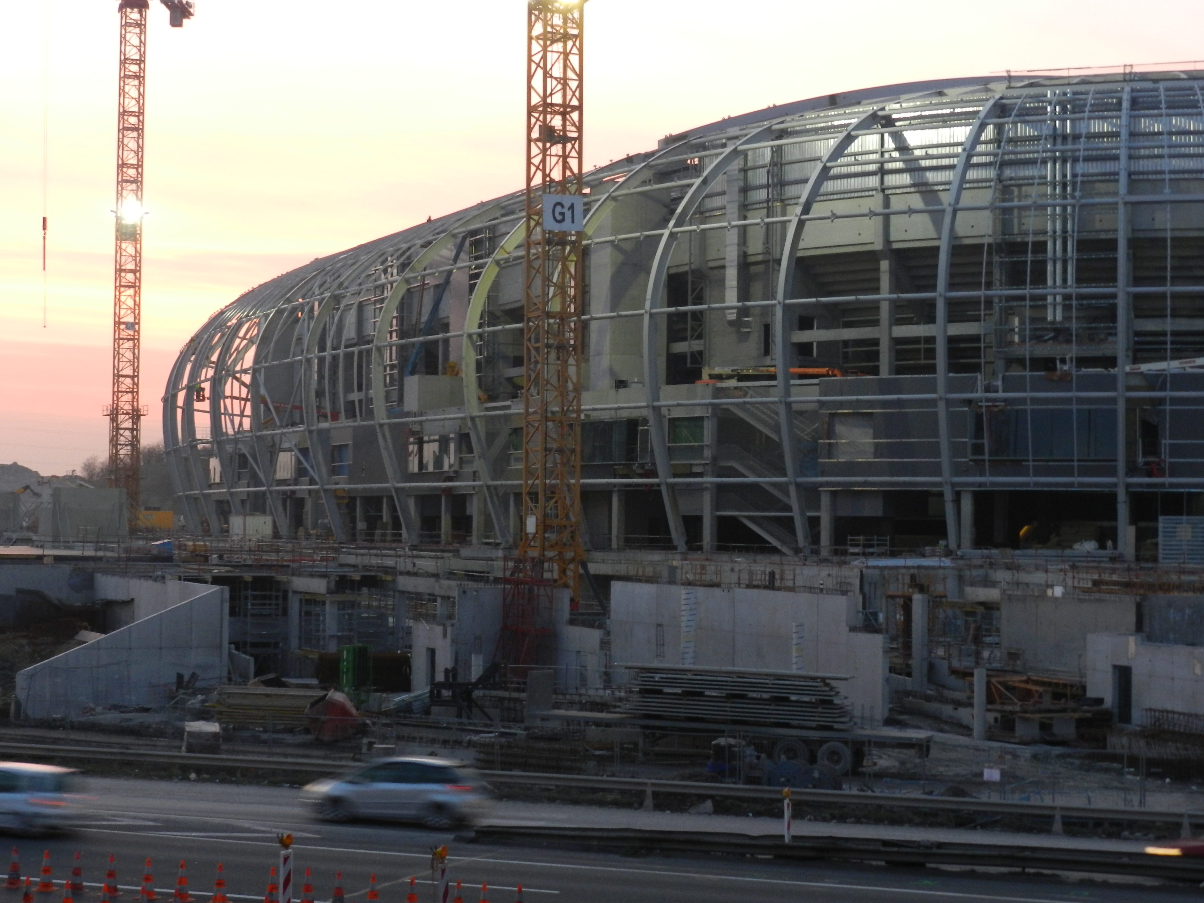 ça y est, ils ont commencé à démonter les tubes oranges supportant au début la toiture en attendant de finir de la pose des arches hautes.