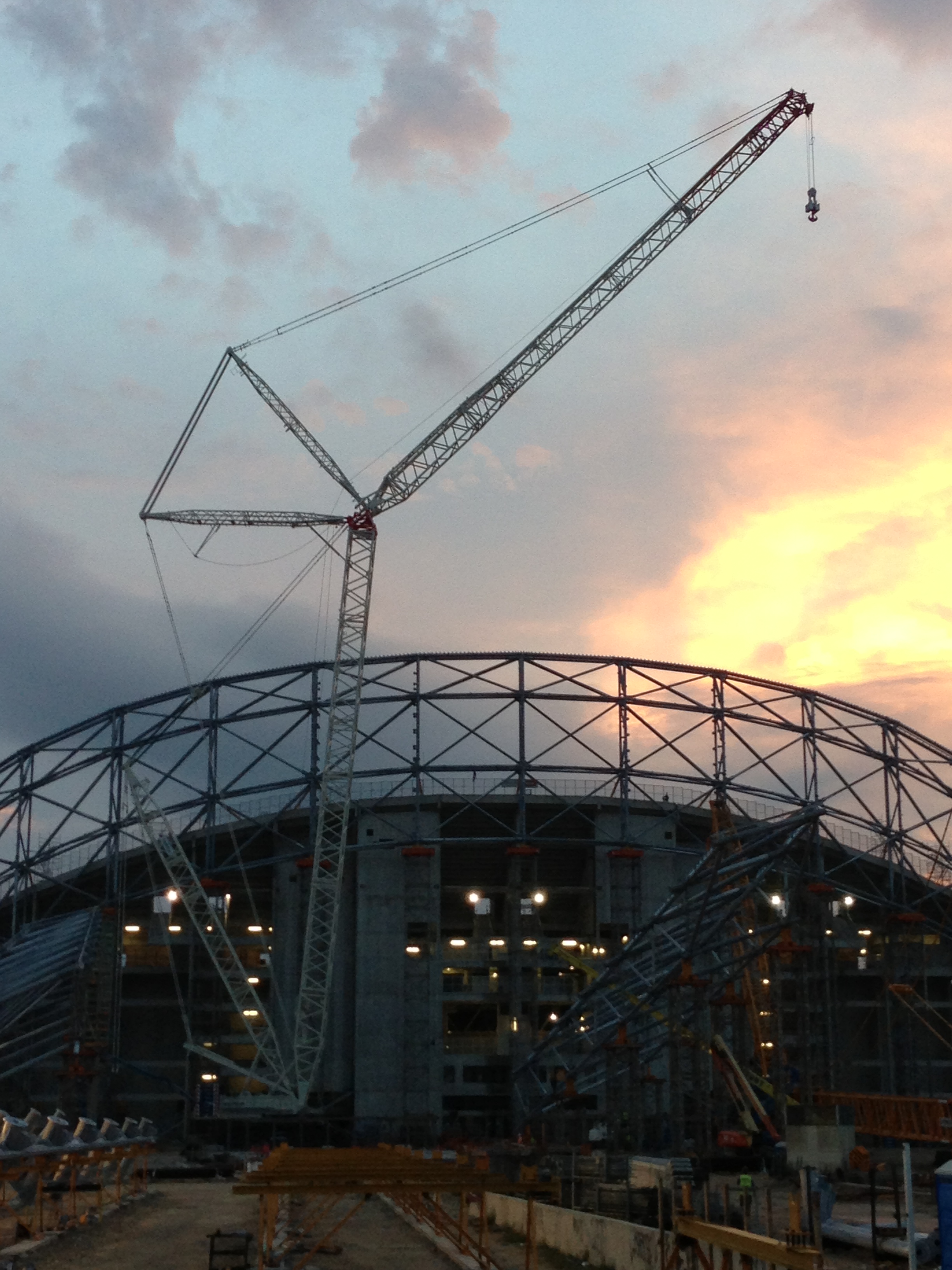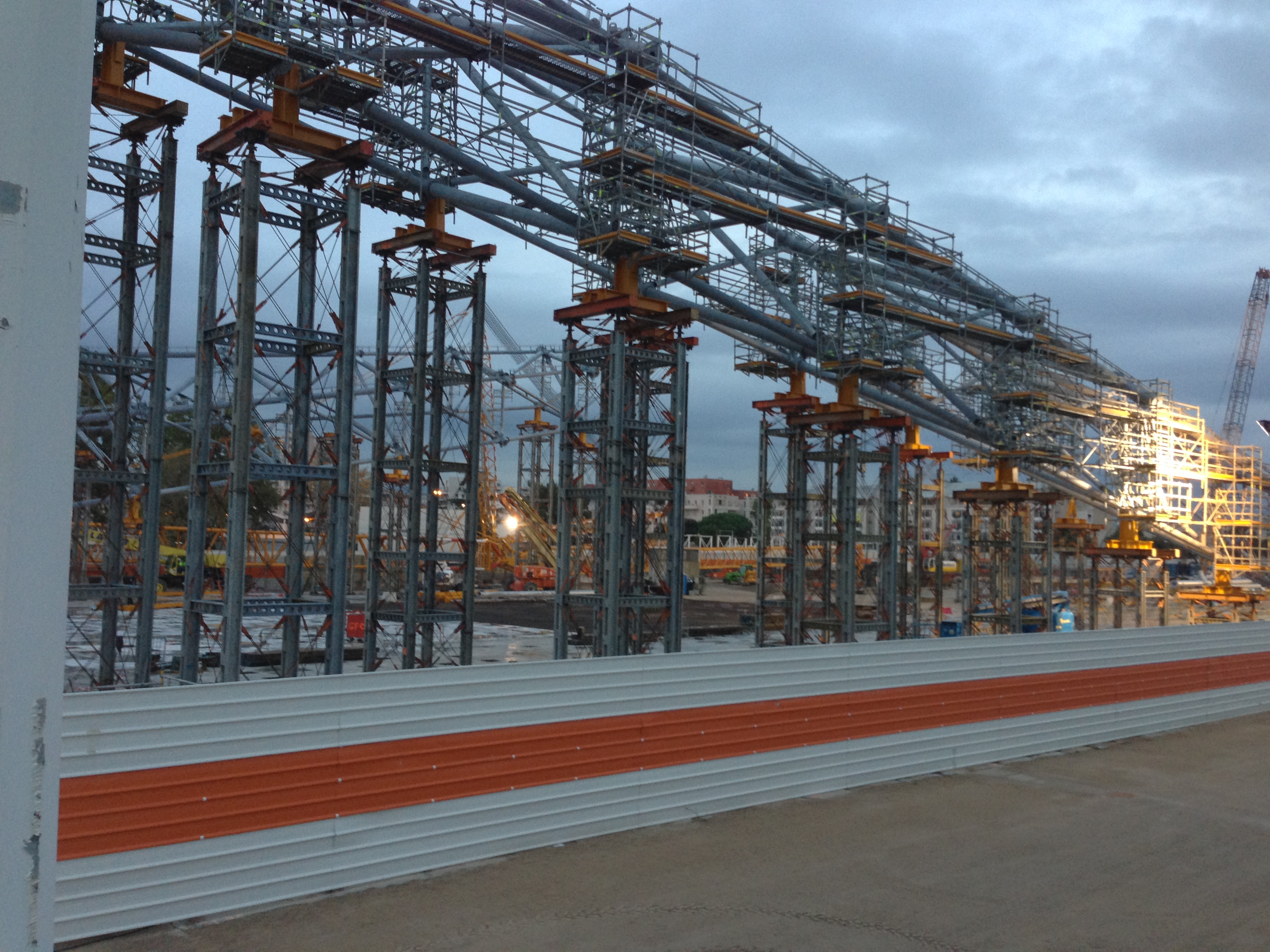 La grue mobile gêne un peu la vue mais il semblerait qu'il y ait 3 radiales de jupes déjà prêtes. Il ne reste plus qu'à les mettre sur les palées du VN