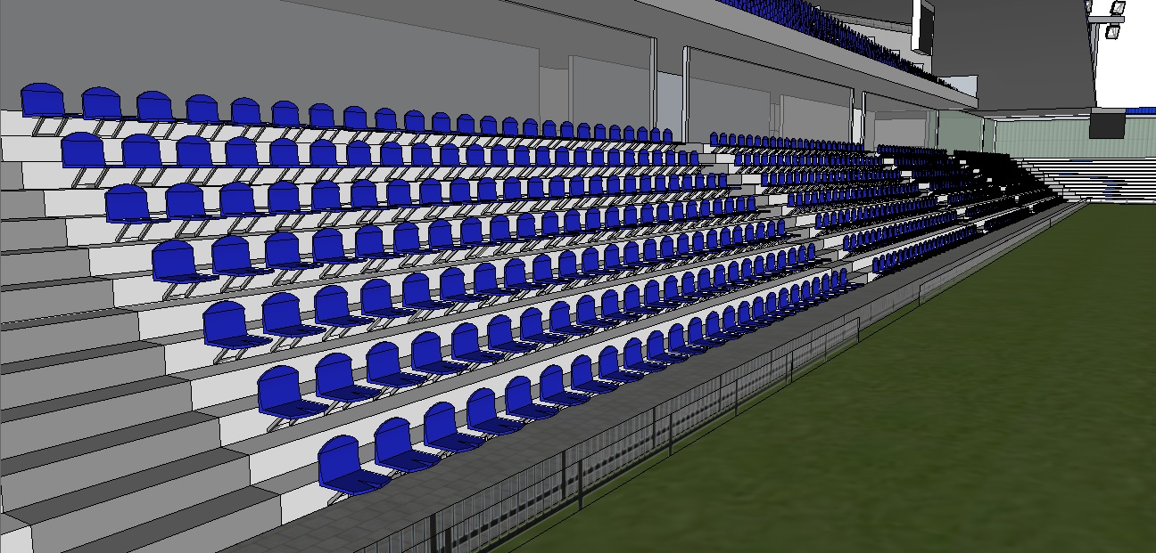 on peut voir le talus et le pourtour classé que je n'ai pas modifié, l'extension de la latérale prenant tout de même appui dessus. Les tribune sont tenues par de grands massifs qui font le look extérieur du stade :