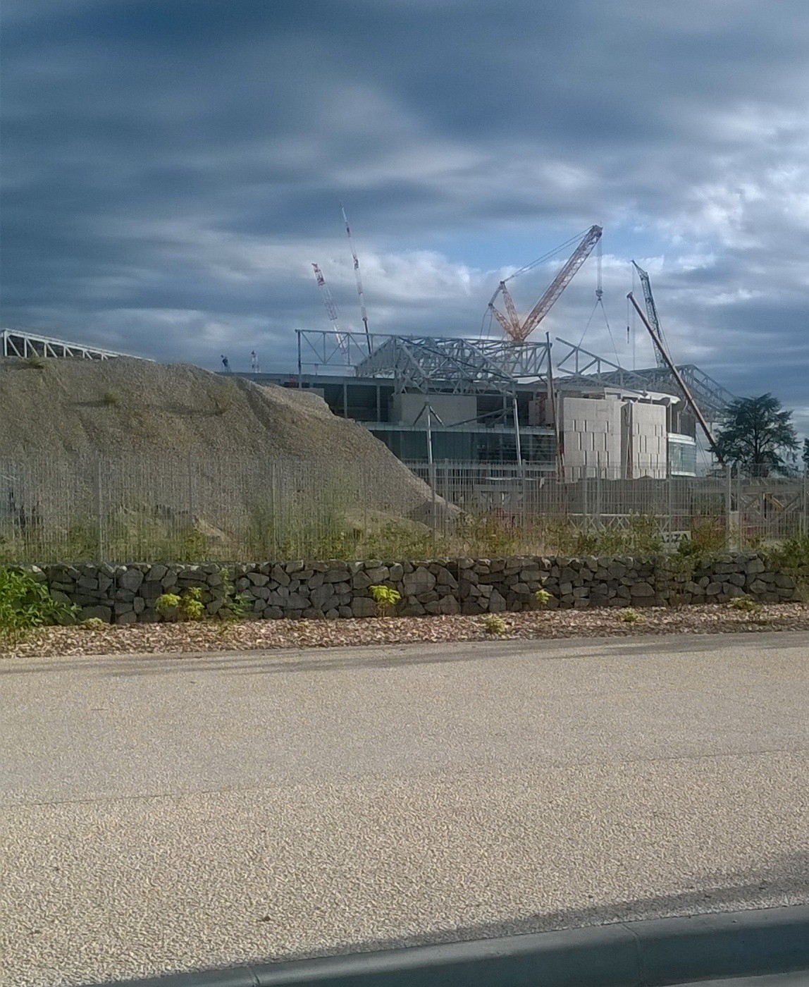 Sinon côté Est bcp d activité e de la grosse verte et des grues mobiles pour finir de remplir les tandems avec la charpente tertiaire et toujours un balai de camion pour emmener les palées du lieu de stockage sud ouest à l'intérieur du stade et de même pour les passerelles techniques pré-montées