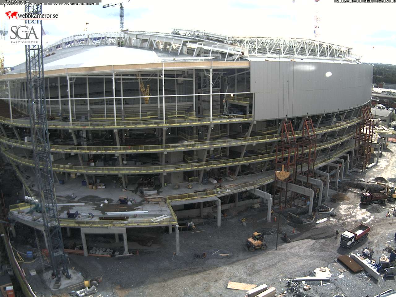 Photos du jour du Stockholmarenan avec la pose de la structure qui permettra la couverture des tribunes (sur la gauche du stade) :