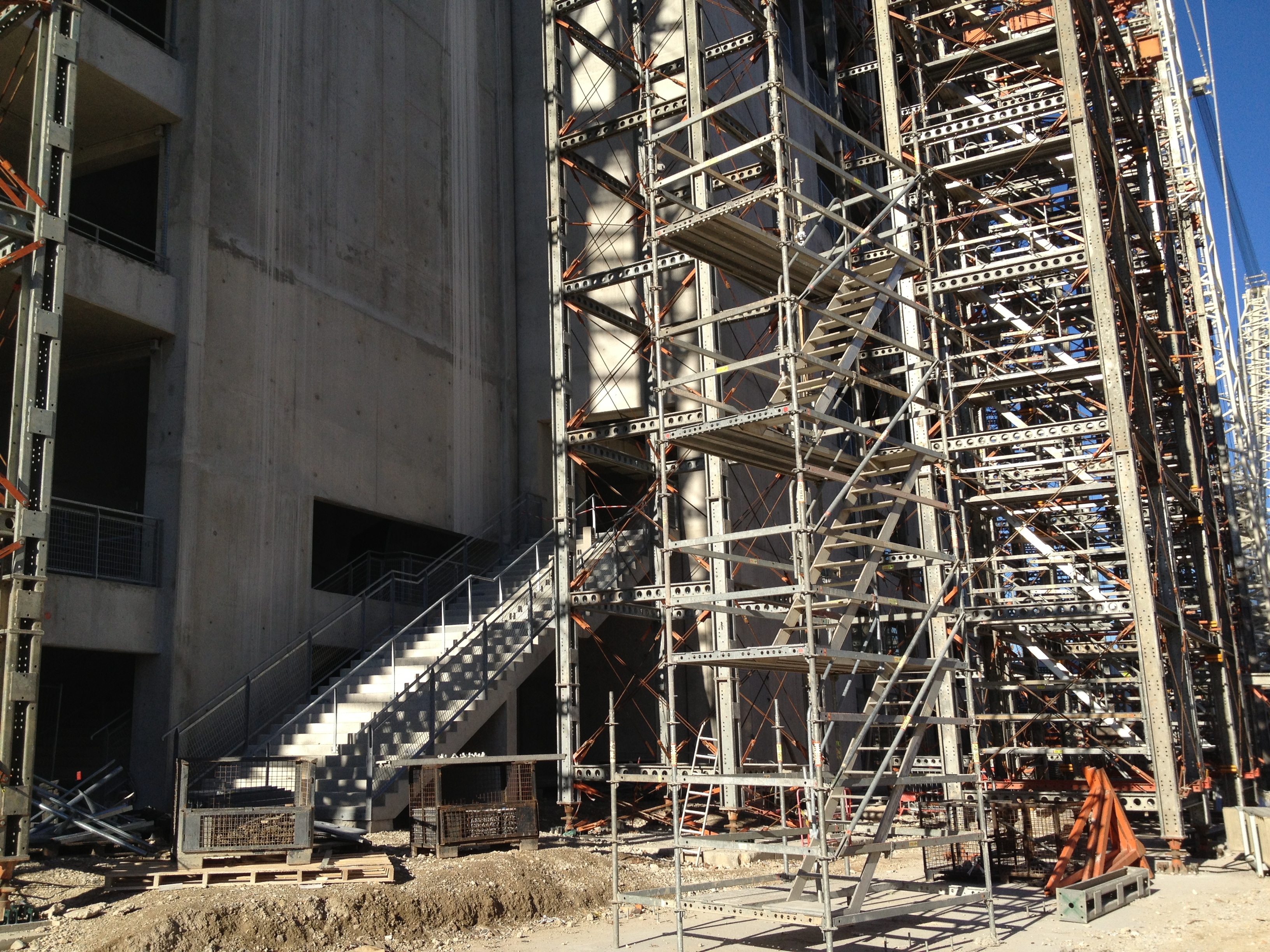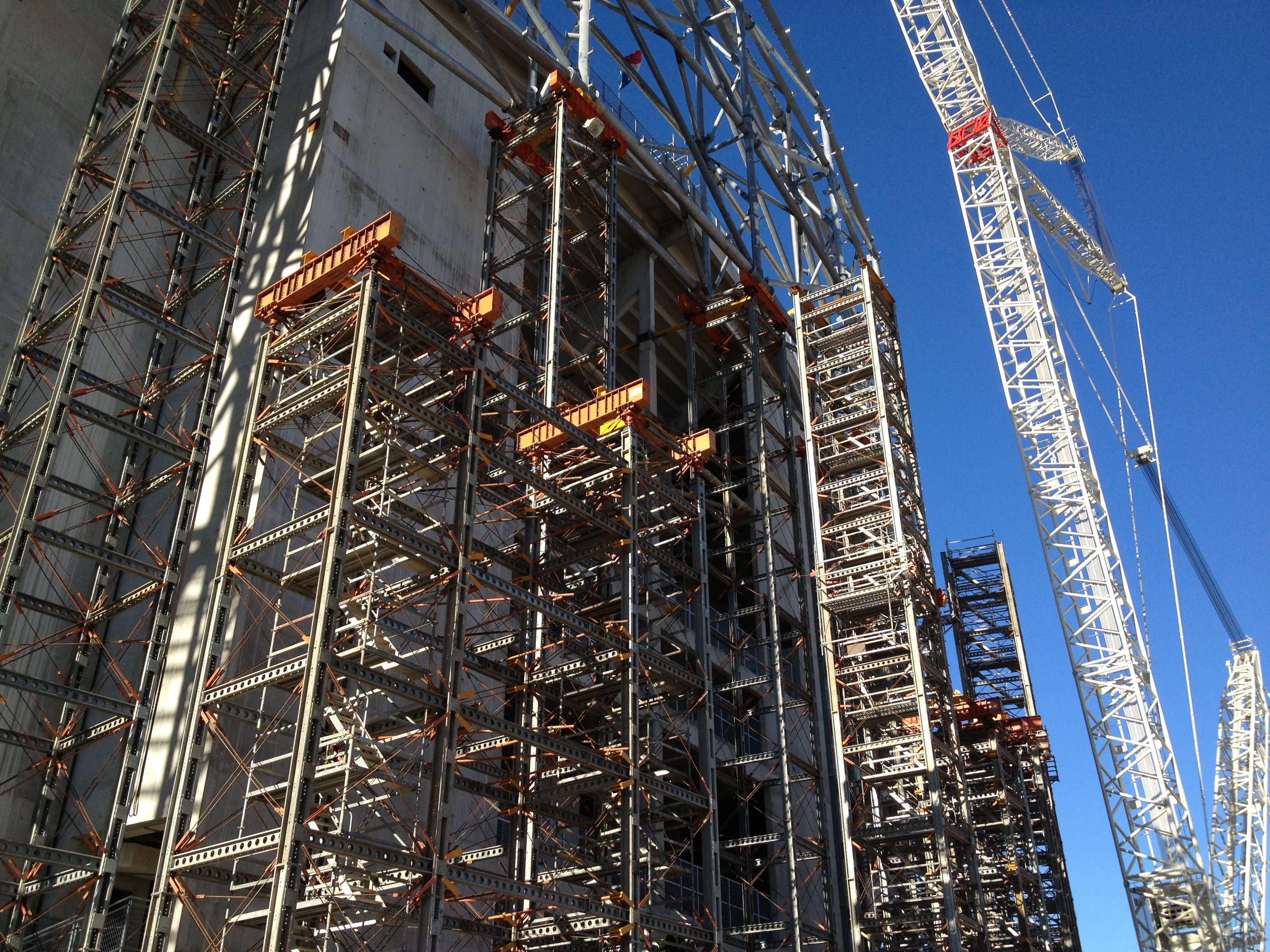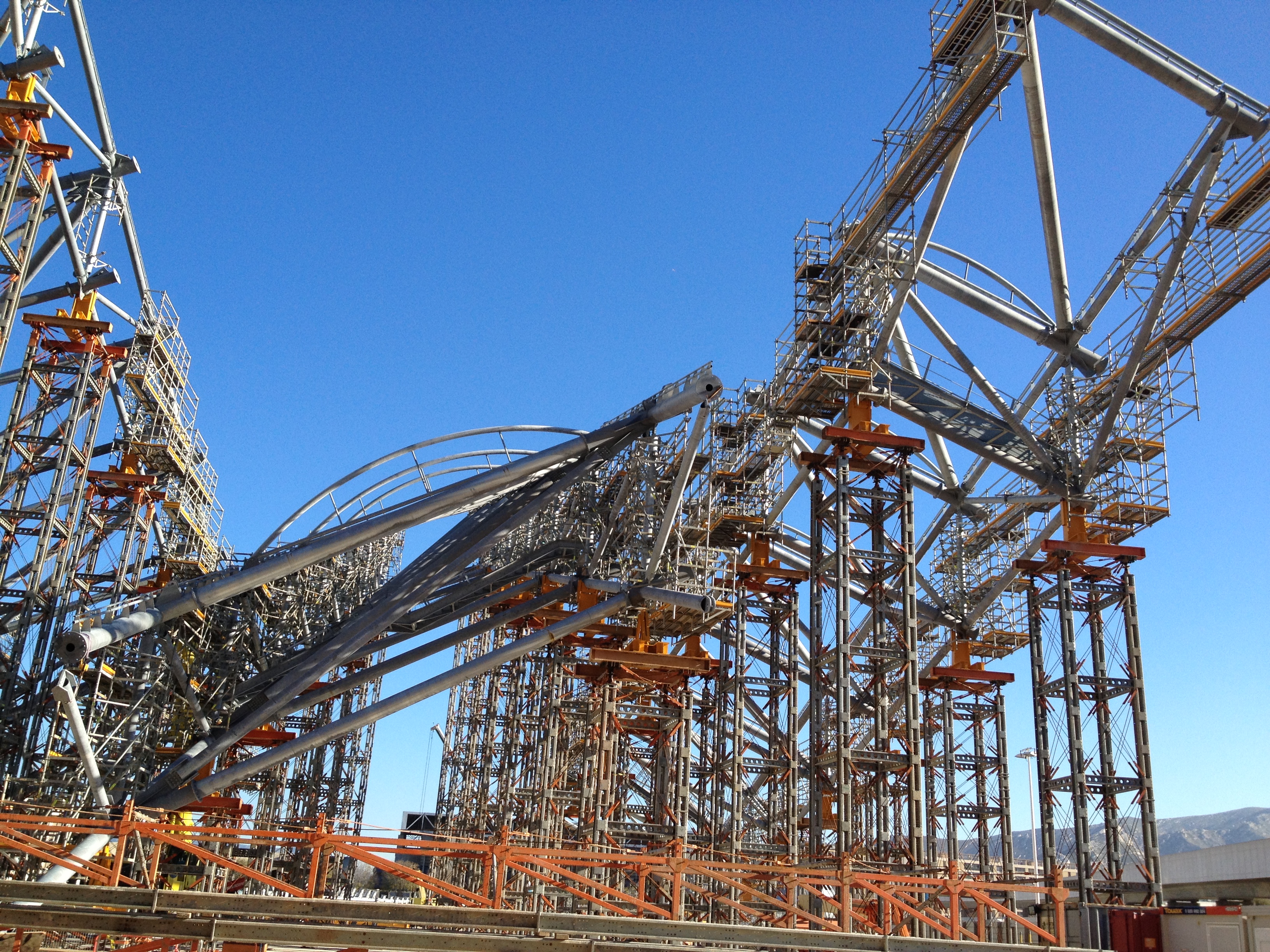 Réponse : L’installation de la station de pré-montage des colis pour le VN va bientôt commencer. Les premiers éléments de charpente sont déjà arrivés. Côté VS, cela se fera plutôt au printemps 2013. Pour info, pour la pose de la charpente côté VN, ce sera une grue 600 tonnes et pour le côté VS ce sera une 700 ou 750 tonnes car il faut enjamber le métro. Autre info, une CC6800 aura normalement la charge de poser deux colis de virages, ceux qui sont les plus proches des radiales de faille côté nord et sud.