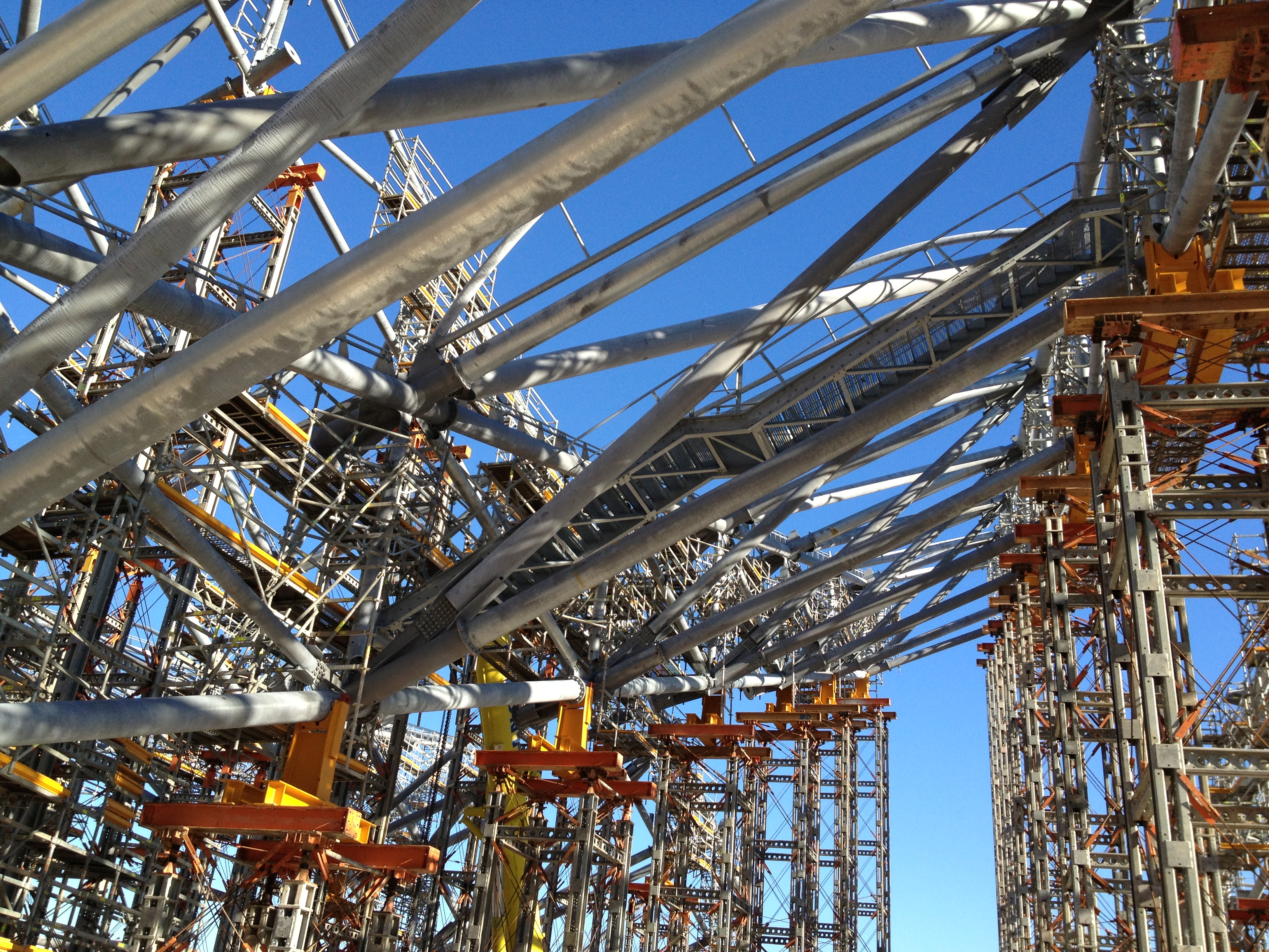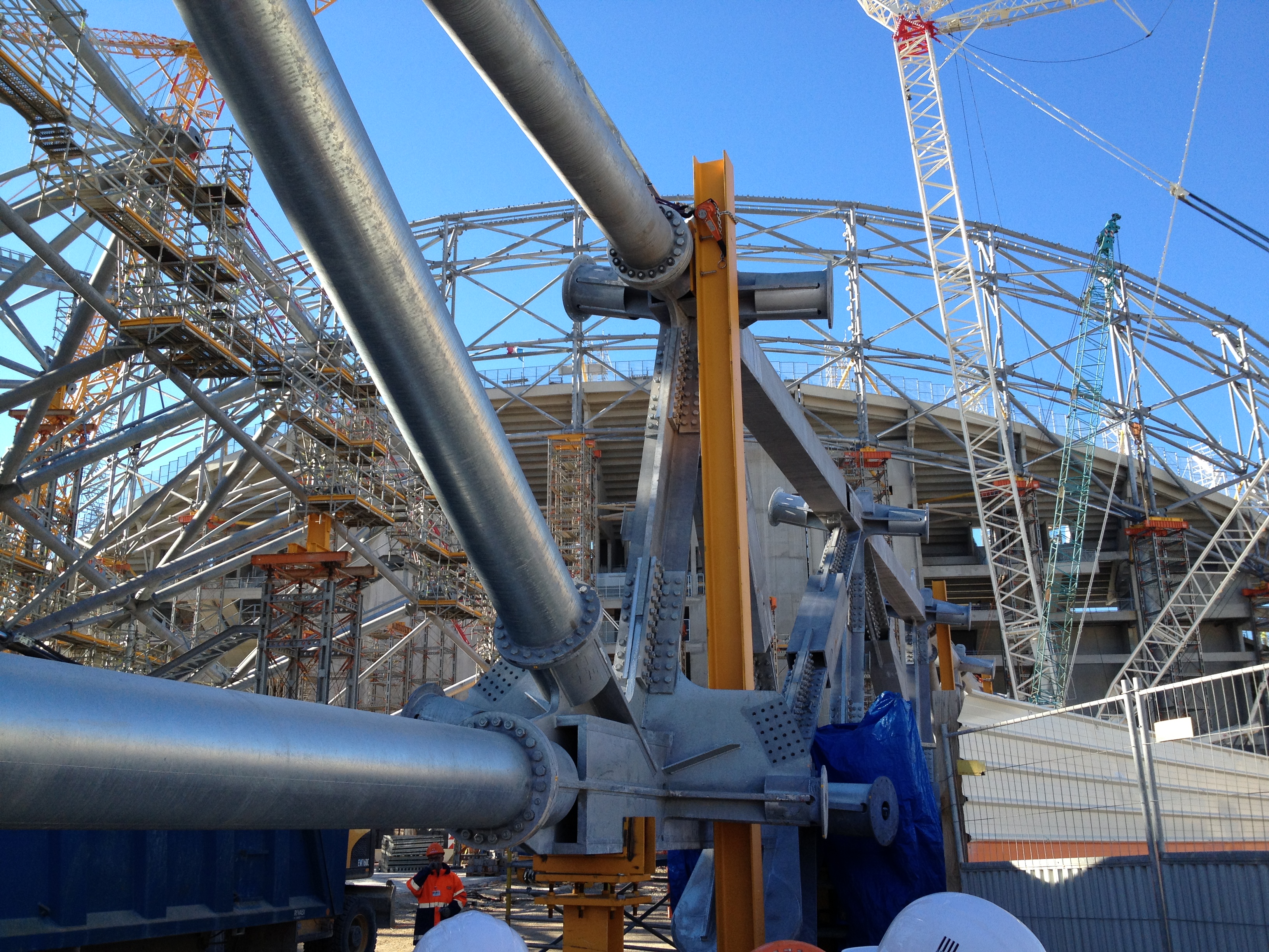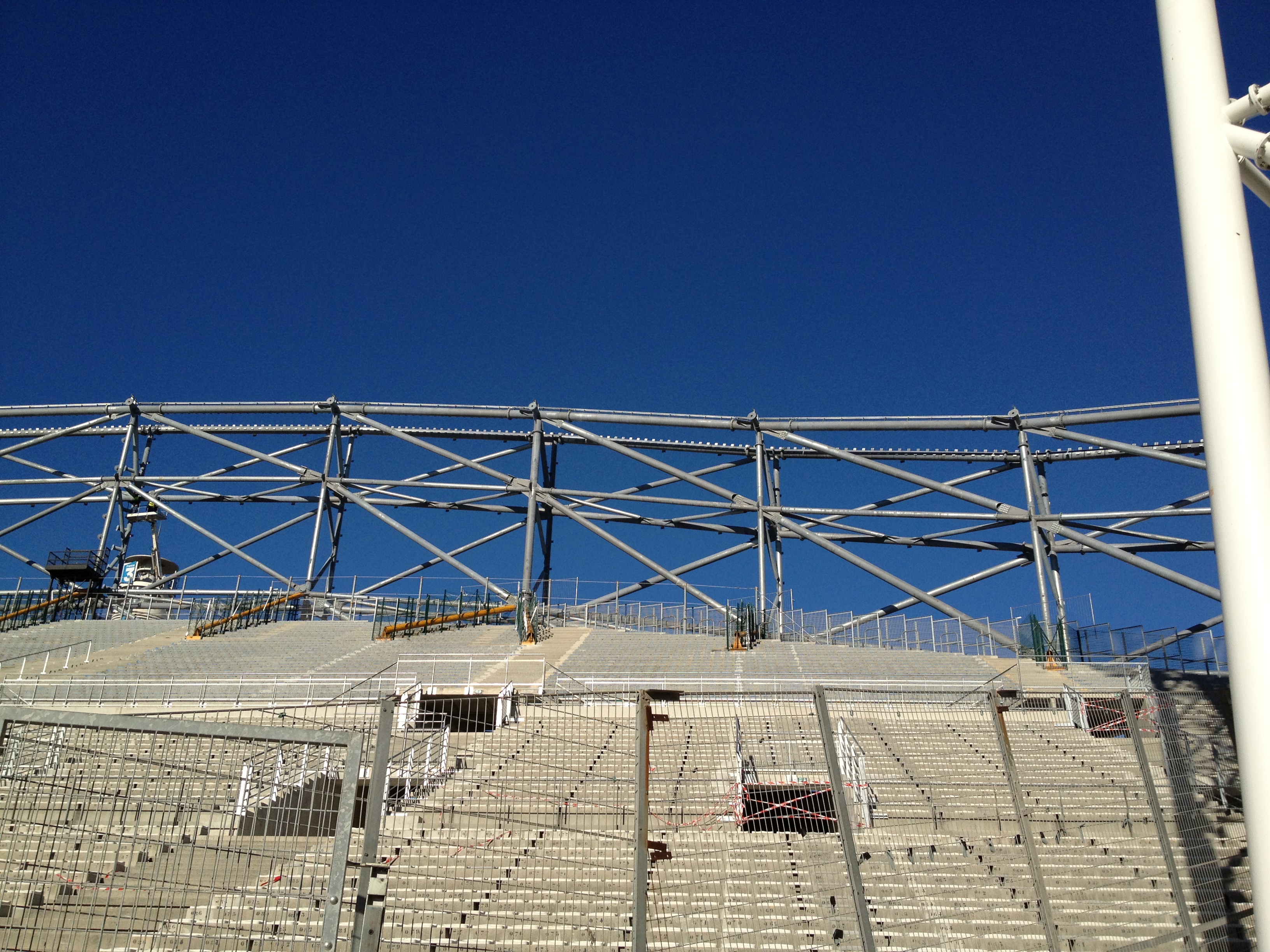 Réponse : AREMA nous a certifié qu’il n’a jamais été prévu que la charpente soit blanche. Depuis le début elle doit être galvanisée et ce avec la meilleure des qualités (niveau 5). On nous a également fait remarquer que la galvanisation est bien plus onéreuse que la peinture (et donc que parler de stade au rabais était un peu déplacé…). Pour info, les palées d’éclairage ont été peintes en blanc pour mieux s’intégrer dans le stade mais en fait elles auraient dû être jaunes comme les bracons. Quant au témoin de charpente (qui est en fait un module de test pour la pose de la toile PTFE surtout) a été peint lui aussi en blanc de manière non préméditée simplement pour protéger les éléments métalliques.