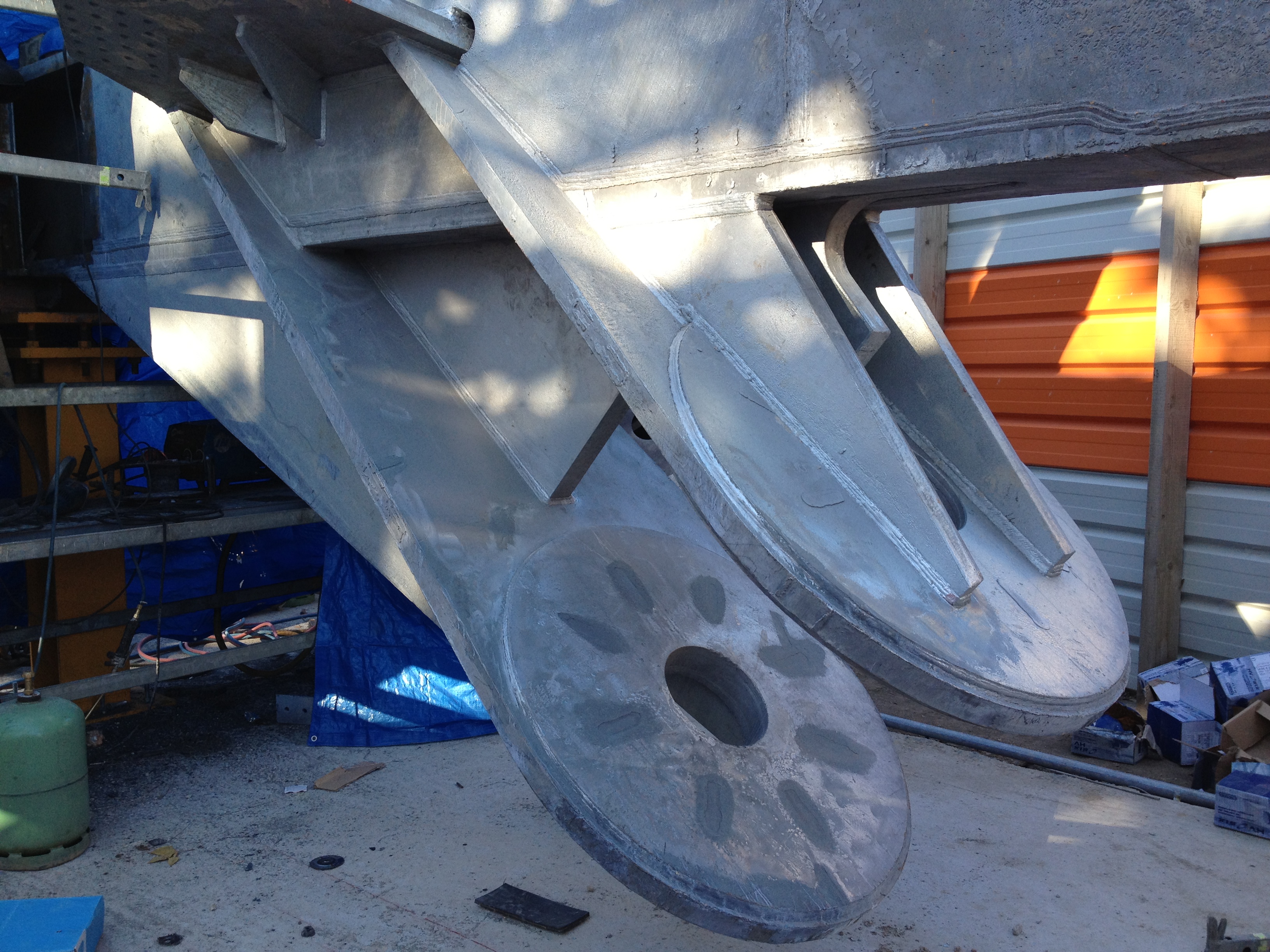 Réponse : Une est finie et la station de montage pour la seconde est en cours de réalisation. En ce qui concerne les radiales de faille, elles sont monstrueuses et très complexes au niveau montage !!! Leur partie centrale (là où va venir se fixer le méga poteau) est carrée. Les études ont montrées qu’il n’était pas possible de faire cette partie en tubulaire.