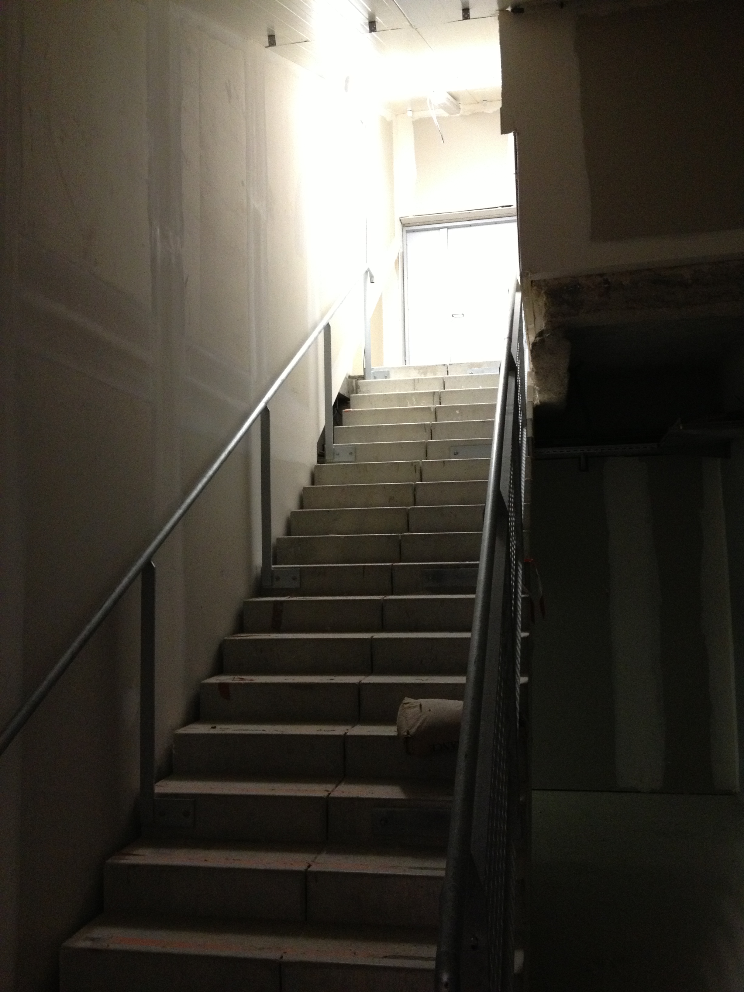 Réponse : Ils sont magnifiques et surtout immenses. Il faut bien imaginer qu’ils font toute la profondeur de la tribune (de la nouvelle façade jusqu’aux gradins). La déco c’est murs blancs et carrelages et faux-plafond noirs. C’est sobre et classe. Il y a trois accès vers les gradins fermés par des portes vitrées.