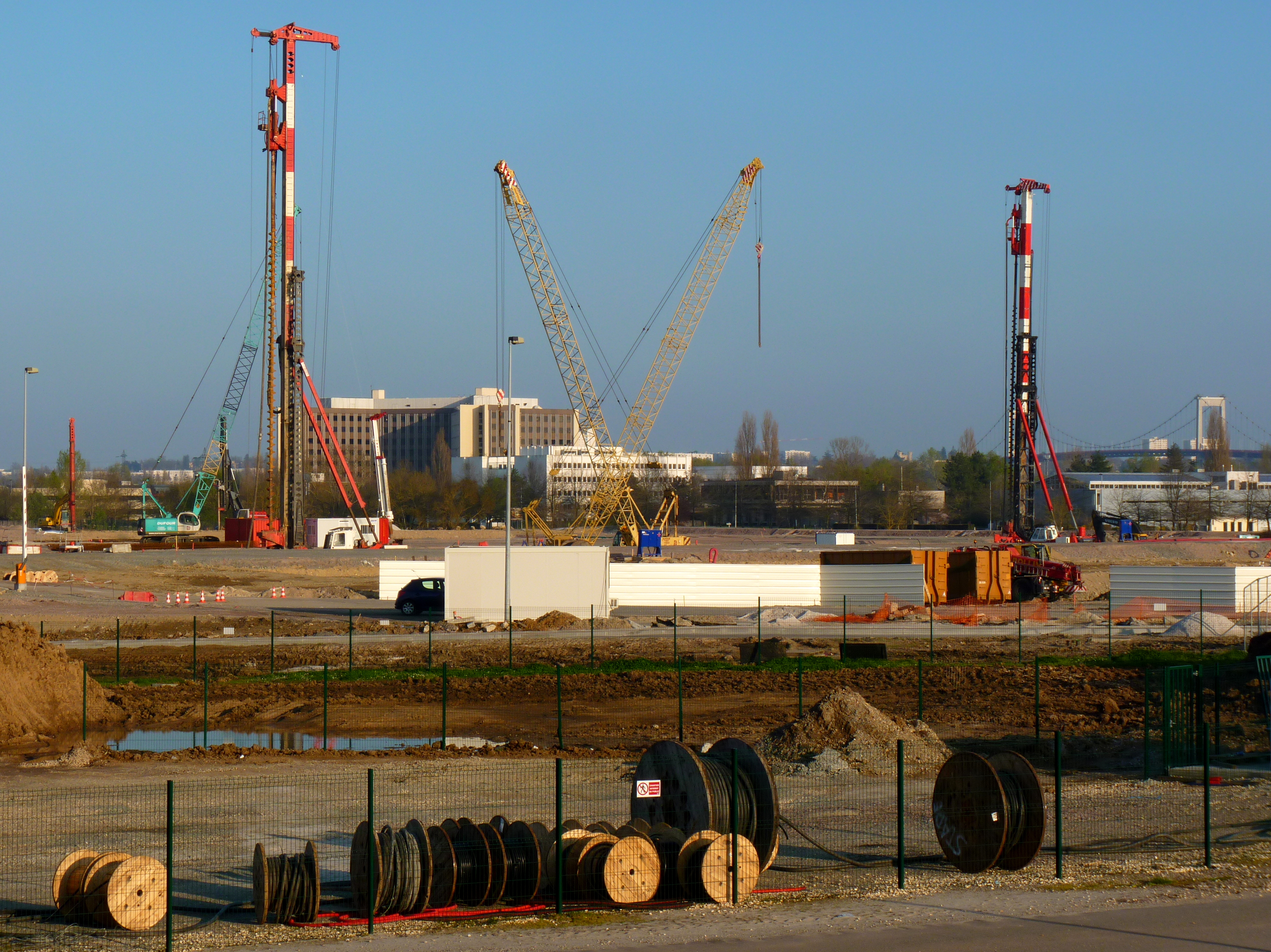 - Les pieux avancent, 3 foreuses sont sur le site depuis 2 semaines, les grues jaunes/bleues s'occupent d'insérer les tiges d'acier entrelacées.
