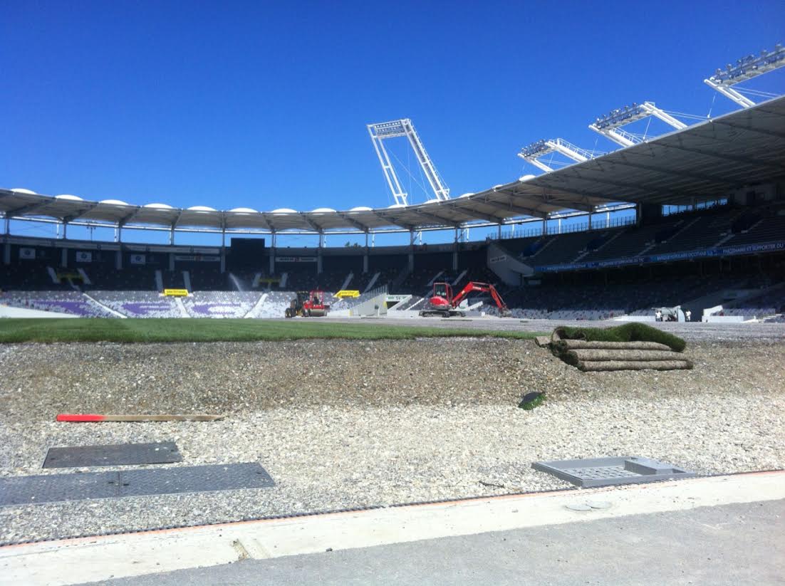 La pelouse, mais aussi les tribunes, les locaux techniques, les sièges... le chantier du Stadium a commencé en 2013, et il doit s'achever en décembre prochain, six mois avant l'Euro 2016 de football. Quatre matches se dérouleront à Toulouse, les 13, 17, 23 et 27 juin (1/8 de finale). On saura au mois de décembre qui jouera au Stadium pendant l'Euro, mais une chose est sûre : une équipe tête de série foulera la nouvelle pelouse, et ce ne sera pas l'équipe de France.