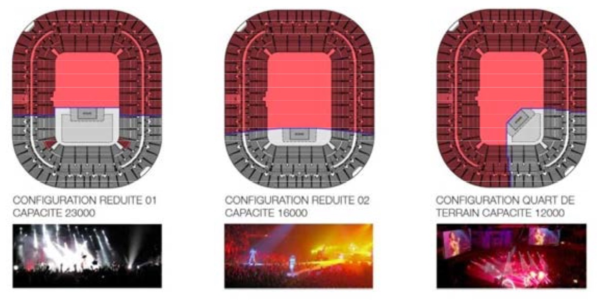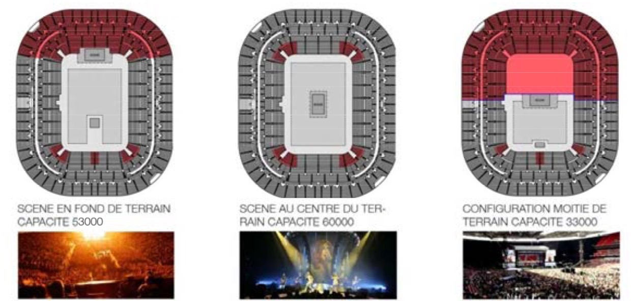 Alors pour répondre sur les capacités du stade suivant les différents configuration du stade, voici quelques présentations: