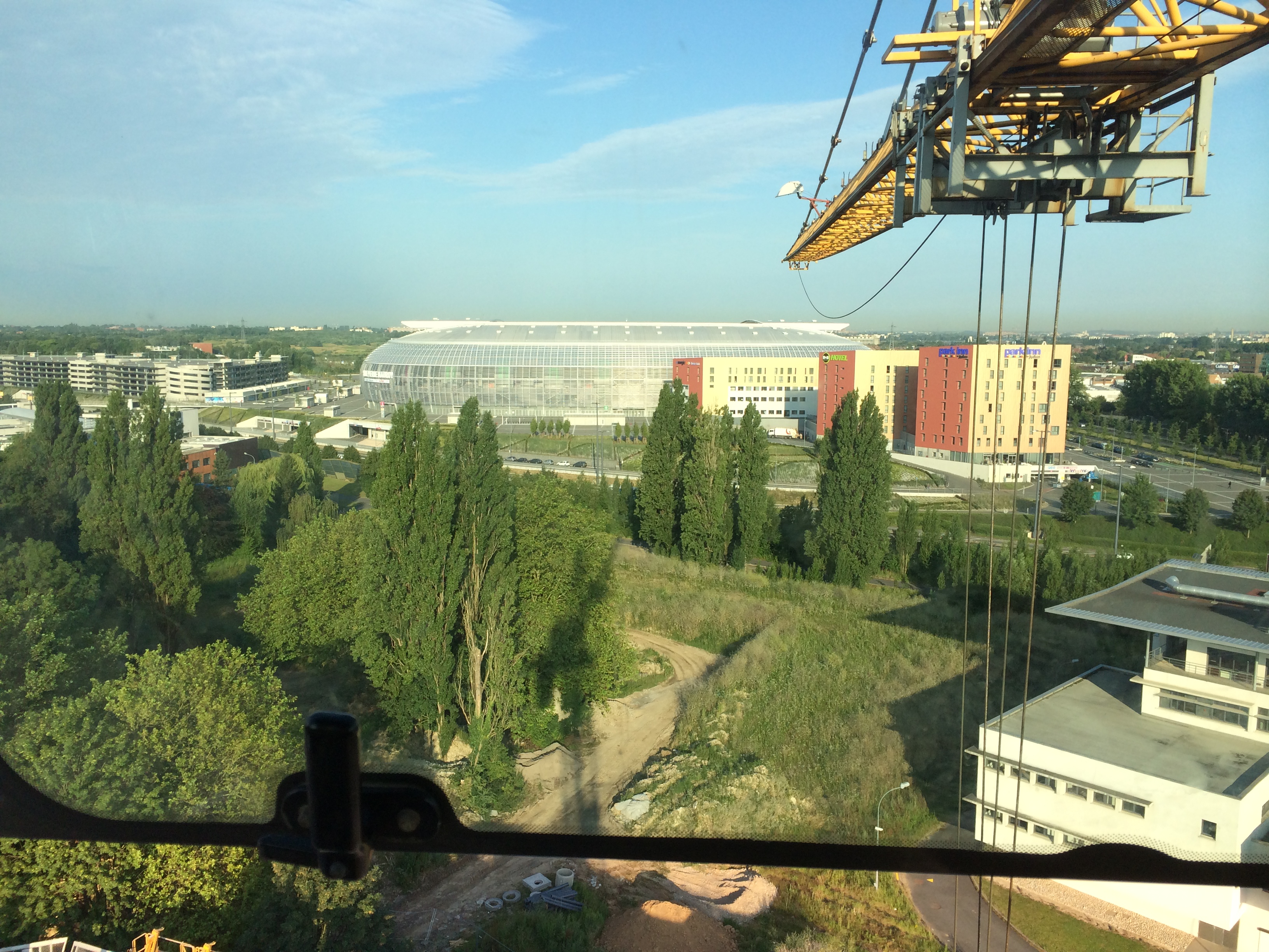 En gros ils ont installé, pour le moment, une plate forme sur le terre plein central, au niveau des terrasses du stade. Il est large à cet endroit, en dessous il y a le grand fossé qui sert de drainage au boulevard