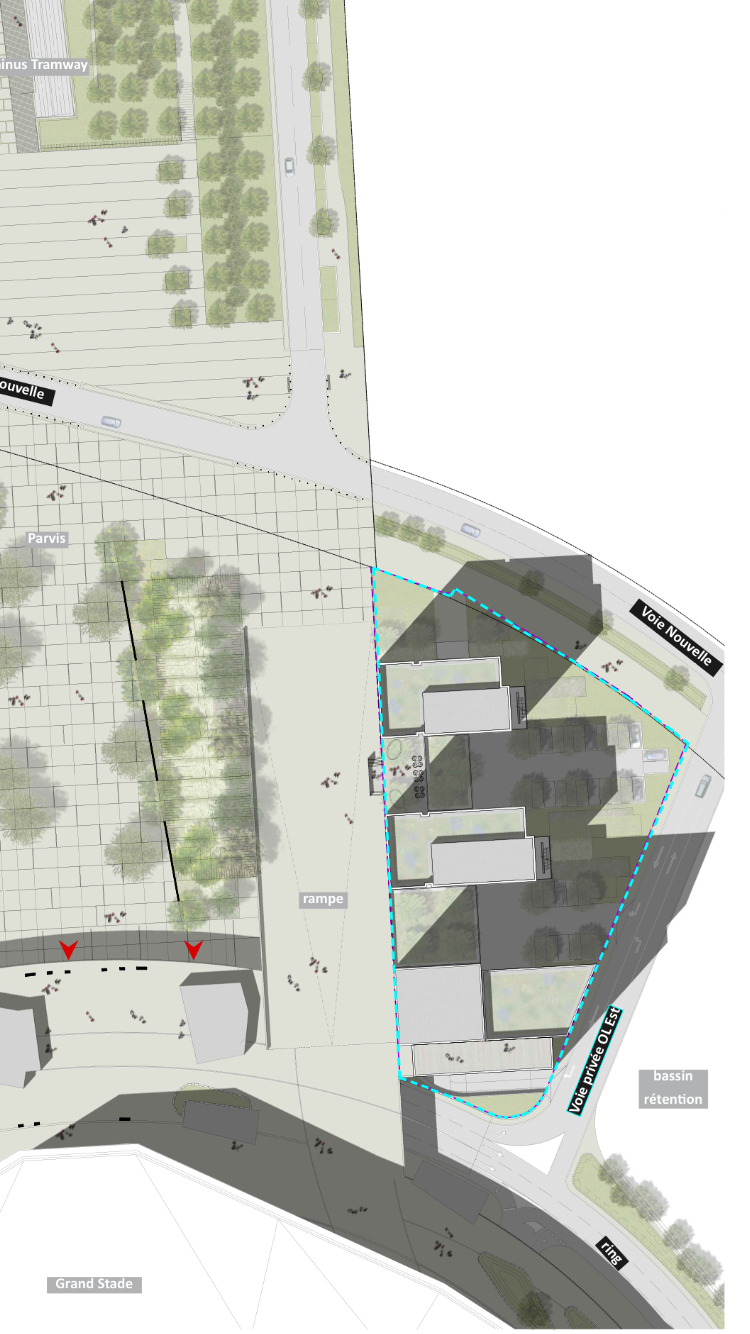 La vue 3D ne correspond pas totalement à la réalité. Les Hotels et Bureaux ne seront pas comme sur le rendu 3D en nord de la route, mais au sud.