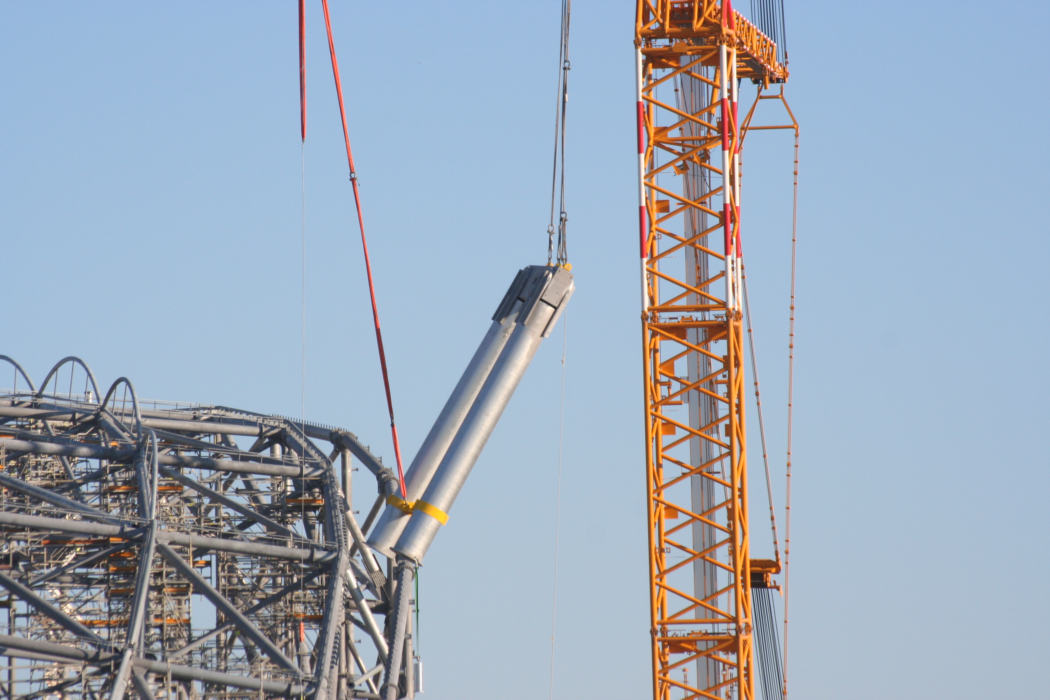 J'ai comme l'impression en comparant les photos du premier et du deuxième levage qu'ils ont carrément inversé le sens d'inclinaison du mega poteau, donc au premier levage il n'était pas bien positionné voire même à l'envers