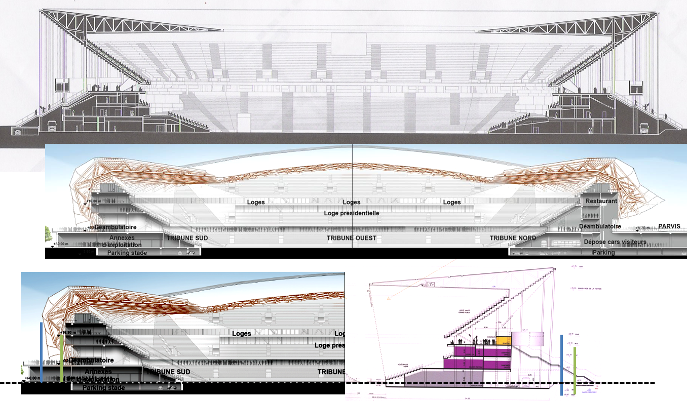 Sinon au final les stades ne sont eux pas énormément différent, l'Allianz Riviera a moins de place parce que les virages sont plus petits. Par contre les laterals doivent etre proche de la hauteur de notre stade. (cf. figure) Et au niveau envergure, avec son large parvis, il doit même être plus grand.