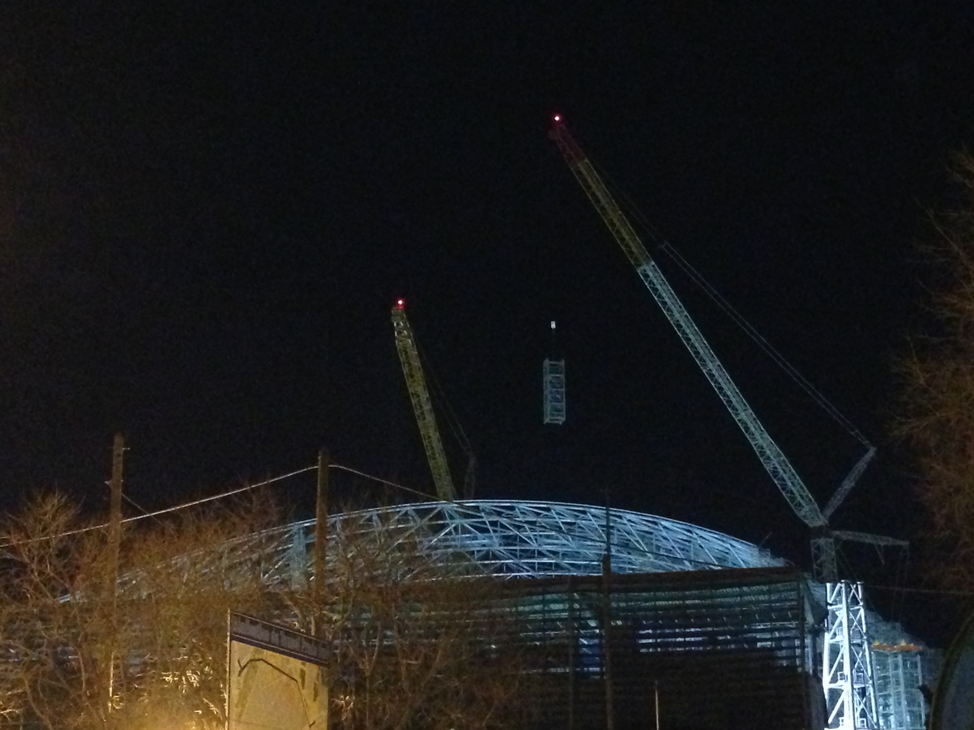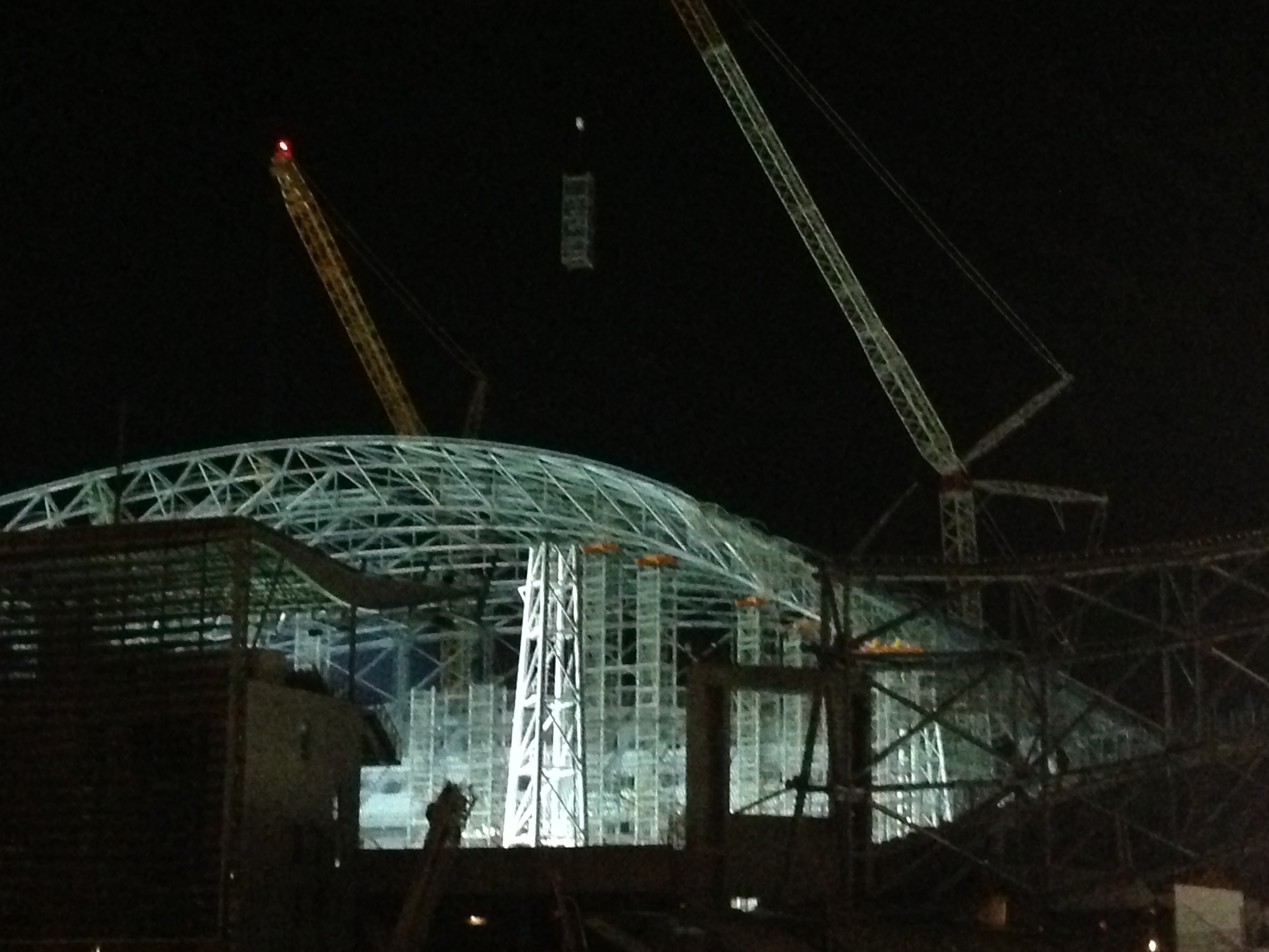 Super photo. olivier, on peut noté aussi la présence de la grue mobile pour le montage de la herse d'éclairage à l'angle virage sud / Jean Bouin surement ce week end.